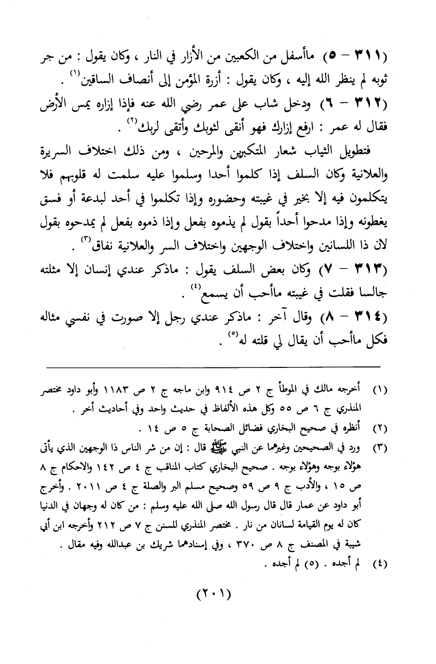 ومن ذلك: اختلاف السريرة والعلانية. وكان السلف إذا كلموا أحداً وسلموا عليه، سلمت له قلوبهم، فلا يتكلمون فيه إلا بخير في غيبته وحضوره. وإذا تكلموا في أحد لبدعة أو لفسق يعظونه. وإذا مدحوا أحداً بقول لم يذموه بفعل. وإذا ذموه بفعل لم يمدحوه بقول؛ لأن ذا اللسانين واختلاف الوجهين واختلاف السر والعلانية نفاق، كان بعض السلف يقول: ما ذكر عندي إنسان إلا مثلته جالساً، فقلت في غيبته ما أحب أن يسمع. وقال الآخر: ما ذكر عندي رجل إلا صورت نفسي في مثاله فكلما أحب أن يقال لي قلته له.