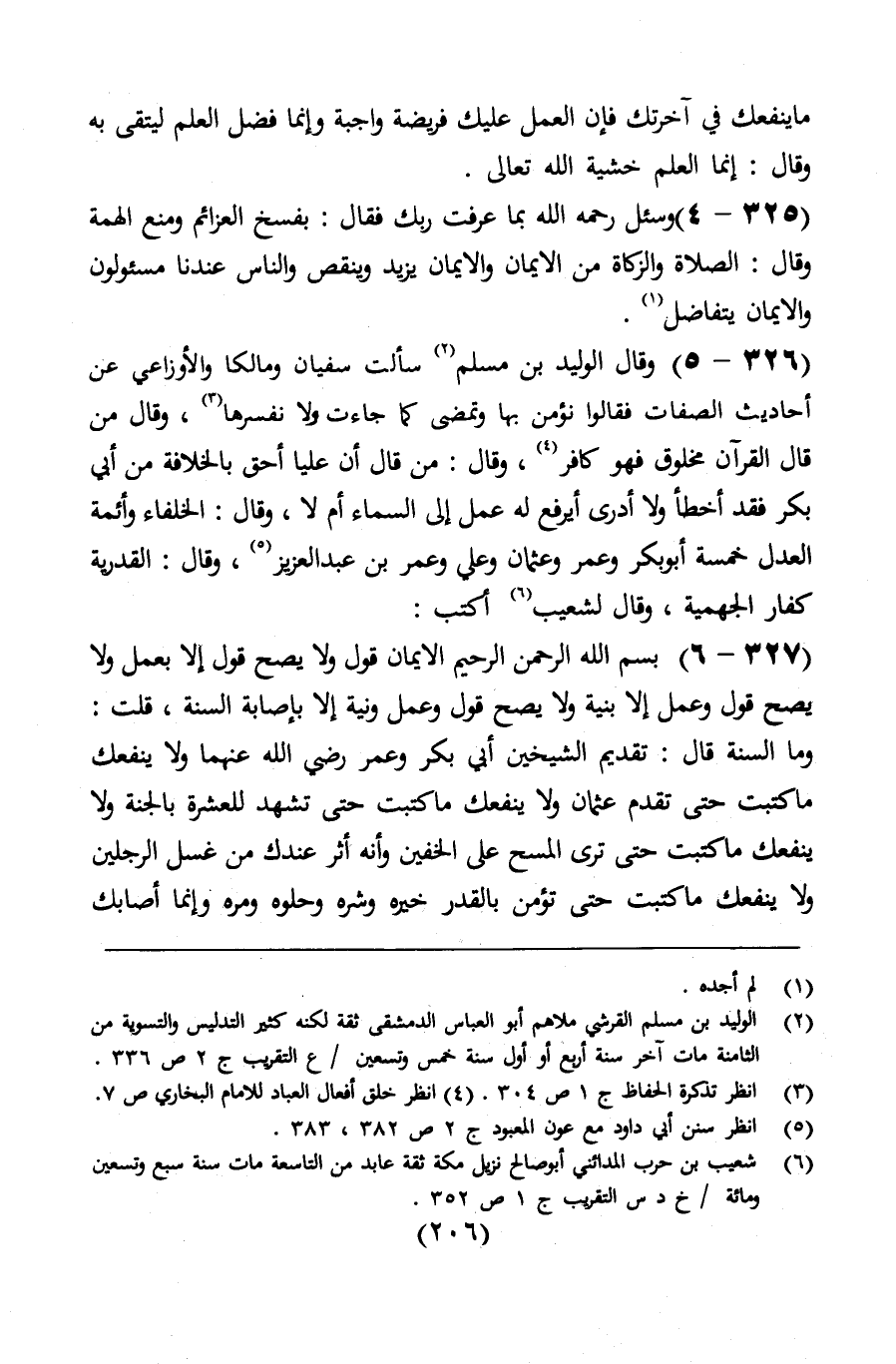 وقال: من قال: " القرآن مخلوق " فهو كافر. وقال: من قال: " إن علياًأحق بالإمامة من أبي بكر " فقد أخطأ، ولا أدري أيرفع له عمل إلى السماء أم لا. وقال: الخلفاء وأئمة العدل خمسة: أبو بكر، وعمر، وعثمان، وعلي، وعمر بن عبد العزيز. وقال: القدرية كفار الجهمية، وقال لشعيب: اكتب بسم الله الرحمن الرحيم، الإيمان قول، ولا يصح قول إلا بعمل، ولا يصح قول وعمل إلا بنية، ولا يصح قول وعمل ونية إلا بإصابة السنة. قلت: وما السنة؟ قال: تقديم الشيخين أبي بكر وعمر رضي الله عنهما، ثم قال: ولا ينفعك ما كتب حتى تقدم عثمان، ولا ينفعك ما كتب حتى تشهد للعشرة بالجنة، ولا ينفعك ما كتب حتى ترى المسح على الخفين، وأنه آثر عندك من غسل الرجلين، ولا ينفعك ما كتب حتى تؤمن بالقدر خيره وشره حلوه ومره، وأن ما أصابك