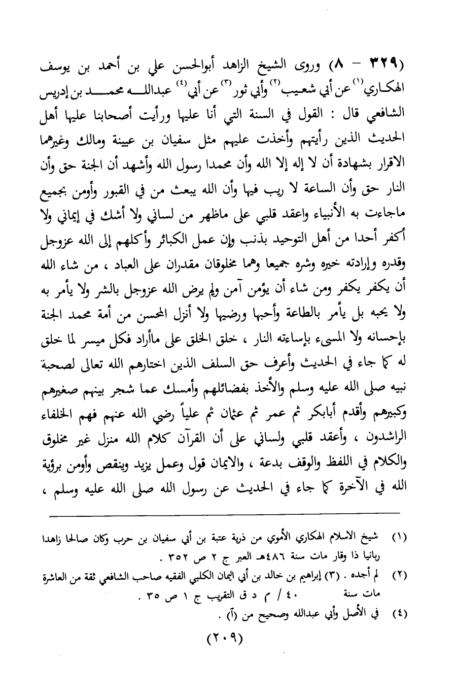 وروى الشيخ الزاهد أبو الحسن علي بن أحمد بن يوسف الهكاري، عن أبي شعيب وأبي ثور، عن أبي عبد الله محمد بن إدريس الشافعي، قال: القول في السنة التي أنا عليها، ورأيت أصحابنا عليها أهل الحديث الذين رأيتهم وأخذت عليهم، مثل سفيان بن عيينة، ومالك، وغيرهما: الإقرار بشهادة أن لا إله إلا الله، وأن محمداً رسول الله، وأشهد أن الجنة حق، وأن النار حق وأن الساعة حق لا ريب فيها، وأن الله يبعث من في القبور، وأؤمن بجميع ما جاءت به الأنبياء، وأعقد قلبي على ما ظهر من لساني، ولا أشك في إيماني، ولا أكفر أحداً من أهل التوحيد بذنب وإن عمل الكبائر، وأكلُهم إلى الله عز وجل وقدره وإرادته خيره وشره جميعاً، وهما مخلوقان مقدران على العباد من الله عز وجل، من شاء الله أن يكفر يكفر، ومن شاء أن يؤمن آمن، ولم يرض الله عز وجل بالشر، ولا يأمر به، ولا يحبه، بل يأمر بالطاعة، وأحبها ورضيها، ولا أنزل المحسن من أمة محمد الجنة بإحسانه، ولا المسئ بإساءته النار، خلق الخلق على ما أراد، فكل ميسر لما خلق له؛ كما جاء في الحديث، وأعرف حق السلف الذين اختارهم الله تعالى لصحبة نبيه صَلَّى اللهُ عَلَيْهِ وَسَلَّمَ، والأخذ بفضائلهم، وامسك عما شجر بينهم صغيره وكبيرهم، وأقدم أبا بكر، ثم عمر، ثم عثمان، ثم علياً رضي الله عنهم، فهم الخلفاء الراشدون، وأعقد قلبي ولساني على أن القرآن كلام الله منزل غير مخلوق، والكلام في اللفظ والوقف بدعة، والإيمان قول وعمل يزيد وينقص، وأؤمن برؤية الله تعالى في الآخرة، كما جاء في الحديث عن رسول الله (،