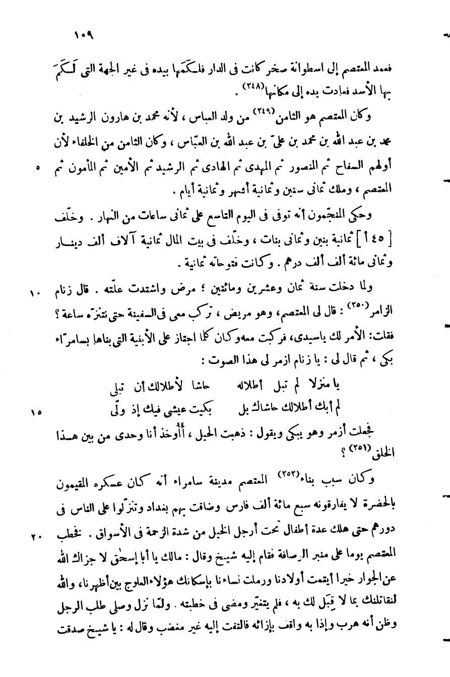 فقلت: الأمر لك يا سيدي، فركبت معه وكان كلما اجتاز على الأبنية التي بناها بسامرّاء بكى، ثم قال لي: يا زنام ازمر لي هذا الصوت: