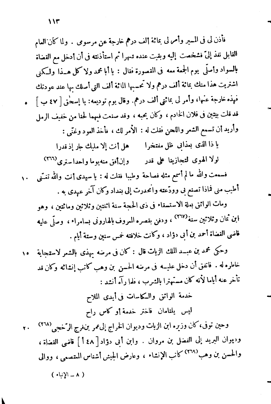 فأذن لي في المسير وأمر لي بمائة ألف درهم خارجة عن مرسومى. ولما كان العام القابل نفذ إليّ فشخصت إليه وبقيت عنده شهرا ثم استأذنته في أن أدخل مع القضاة بالسواد وأصلّى يوم الجمعة معه في المقصورة فقال: يا أبا محمد ولا كل هذا ولكنى اشتريت هذا منك بمائة ألف درهم ولا تحسبها المائة ألف التي أصلك بها عند عودتك فهذه خارجة عنها، وأمر لي بمائتي ألف درهم. وقال يوم توديعه: يا إسحاق [47 ب] قد قلت بيتين في فلان الخادم، وكان يحبه، وقد صنعت فيهما لحنا من خفيف الرمل وأريد أن تسمع الشعر واللحن فقلت له: الأمر لك، فأخذ العود وغنّى: