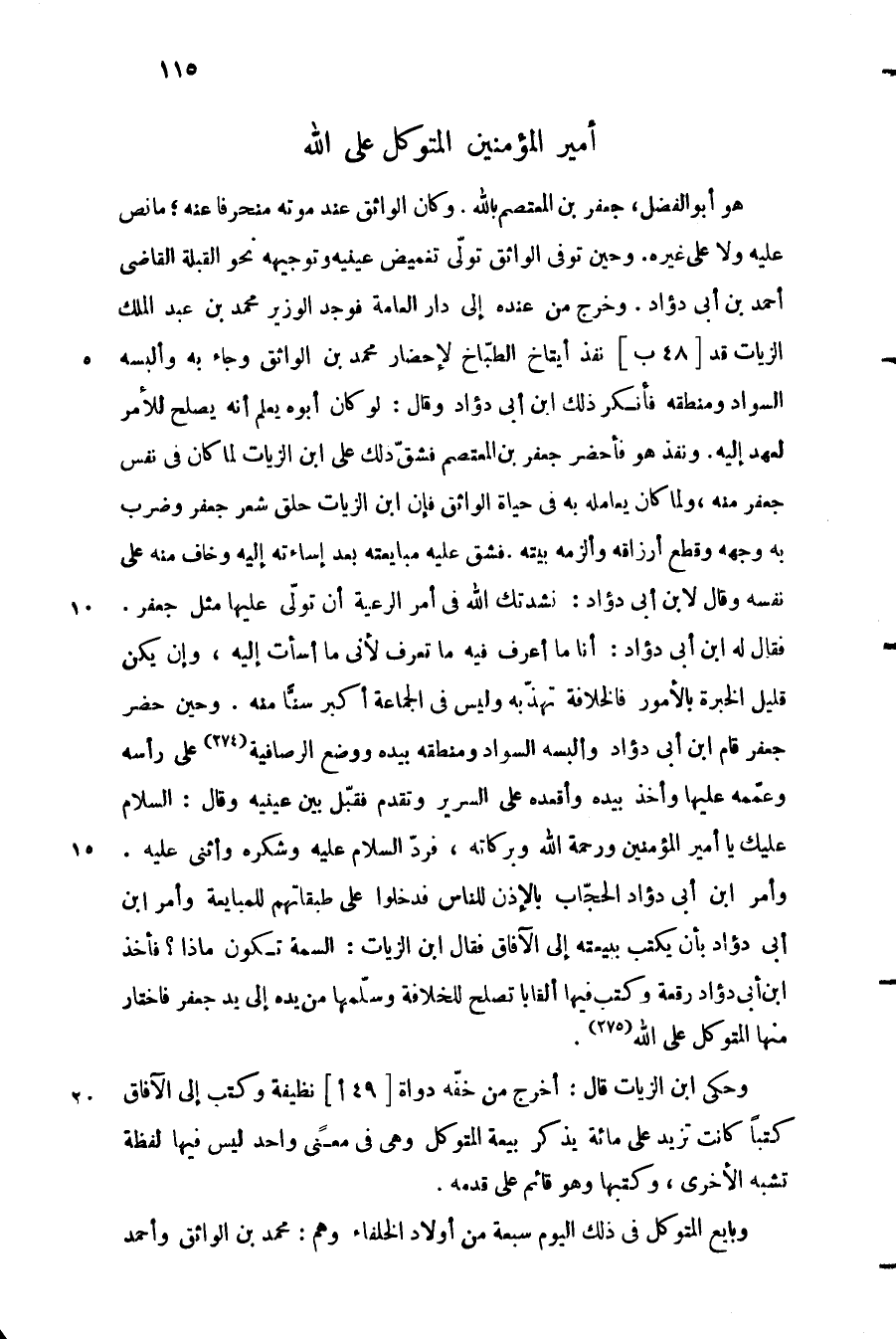 هو أبو الفضل، جعفر بن المعتصم باللَّه. وكان الواثق عند موته منحرفا عنه، ما نص عليه ولا على غيره. وحين توفى الواثق تولّى تغميض عينيه وتوجيهه نحو القبلة القاضي أحمد بن أبى دؤاد. وخرج من عنده إلى دار العامة فوجد الوزير محمد بن عبد الملك الزيات قد [48 ب] نفذ إيتاخ الطبّاخ لإحضار محمد بن الواثق وجاء به وألبسه السواد ومنطقه فأنكر ذلك ابن أبى دؤاد وقال: لو كان أبوه يعلم أنه يصلح للأمر لعهد إليه. ونفذ هو فأحضر جعفر بن المعتصم فشقّ ذلك على ابن الزيات لما كان في نفس جعفر منه، ولما كان يعامله به في حياة الواثق فإن ابن الزيات حلق شعر جعفر وضرب به وجهه وقطع أرزاقه وألزمه بيته. فشق عليه مبايعته بعد إساءته إليه وخاف منه على نفسه وقال لابن أبى دؤاد: نشدتك الله في أمر الرعية أن تولّى عليها مثل جعفر.