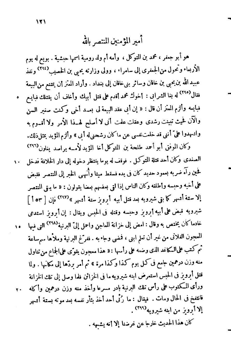 وكان الموفق أبو أحمد طلحة بن المتوكل أخا المؤيد لأمه يراصد يغلون «296» الصغدي وكان أحد قتلة المتوكل. فوقف له يوما ينتظر دخوله إلى دار الخلافة فدخل فحين رآه ضربه بعمود حديد كان في يده فسقط ميتا وأنهى الخبر إلى المنتصر فقبض على أخيه وحبسه وأطلقه وكان الناس إذا لقي بعضهم بعضا يقولون: «ما يبقى المنتصر إلا ستة أشهر كما بقي شيرويه بعد قتل أبيه أبرويز ستة أشهر» «297» فإن [53 أ] شيرويه قبض على أبيه أبرويز وحبسه وقتله في الحبس ويقال: إن أبرويز استدعى خادما كان يختص به وقال: امض إلى خزانة المعاجن واحمل إليّ البرنية «298» التي فيها المعجون الفلاني من غير أن تعلم ابني، فمضى وجاء به. ففرّغ البرنية وملأها سم ساعة ثم كتب على الكاغد الّذي وضعه على رأسها: «هذا معجون يقوّى على الجماع من تناول منه وزن درهمين جامع في كل يوم كذا وكذا مرة» ثم أمر بردّها إلى مكانها. ولما قتل أبرويز في الحبس استعرض ابنه شيرويه ما في الخزائن فلما وصل إلى تلك الخزانة ورأى المكتوب على رأس تلك البرنية بادر مسرعا وأخذ منه وزن درهمين وأكله فانتفخ في الحال ومات. فيقال: ما رئي أحد أخذ بثأر نفسه بعد موته بستة أشهر إلا أبرويز من ابنه شيرويه «299» .