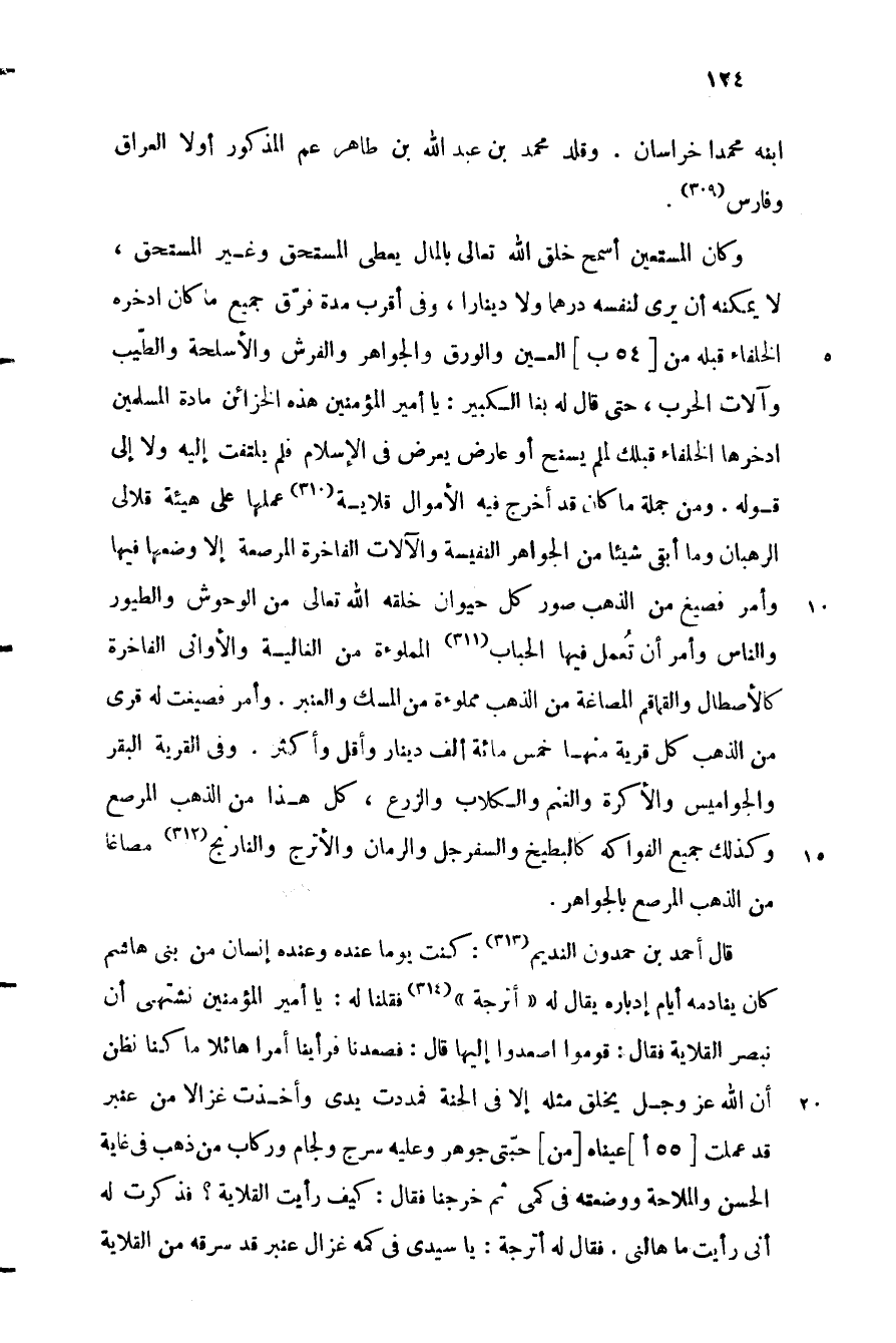 وكان المستعين أسمح خلق الله تعالى بالمال يعطى المستحق وغير المستحق، لا يمكنه أن يرى لنفسه درهما ولا دينارا، وفي أقرب مدة فرّق جميع ما كان أدخره الخلفاء قبله من [54 ب] العين والورق والجواهر والفرش والأسلحة والطّيب وآلات الحرب، حتى قال له بغا الكبير: يا أمير المؤمنين هذه الخزائن مادة المسلمين أدخرها الخلفاء قبلك لملم يسنح أو عارض يعرض في الإسلام فلم يلتفت إليه ولا إلى قوله. ومن جملة ما كان قد أخرج فيه الأموال قلاية «310» عملها على هيئة قلالى الرهبان وما أبقى شيئا من الجواهر النفيسة والآلات الفاخرة المرصعة إلا وضعها فيها وأمر فصيغ من الذهب صور كل حيوان خلقه الله تعالى من الوحوش والطيور والناس وأمر أن تعمل فيها الحباب «311» المملوءة من الغالية والأواني الفاخرة كالأصطال والقماقم المصاغة من الذهب مملوءة من المسك والعنبر. وأمر فصيغت له قرى من الذهب كل قرية منها خمس مائة ألف دينار وأقل وأكثر. وفي القرية البقر والجواميس والأكرة والغنم والكلاب والزرع، كل هذا من الذهب المرصع وكذلك جميع الفواكه كالبطيخ والسفرجل والرمان والأترج والنارنج «312» مصاغا من الذهب المرصع بالجواهر.