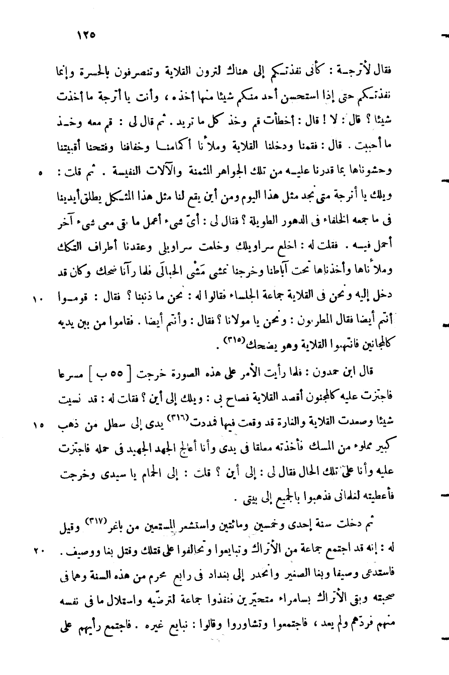 قال ابن حمدون: فلما رأيت الأمر على هذه الصورة خرجت [55 ب] مسرعا فاجتزت عليه كالمجنون أقصد القلاية فصاح بى: ويلك إلى أين؟ فقلت له: قد نسيت شيئا وصعدت القلاية والغارة قد وقعت فيها فمددت «316» يدي إلى سطل من ذهب كبير مملوء من المسك فأخذته معلقا في يدي وأنا أعالج الجهد الجهيد في حمله فاجتزت عليه وأنا على تلك الحال فقال لي: إلى أين؟ قلت: إلى الحمام يا سيدي وخرجت فأعطيته لغلماني فذهبوا بالجميع إلى بيتي.