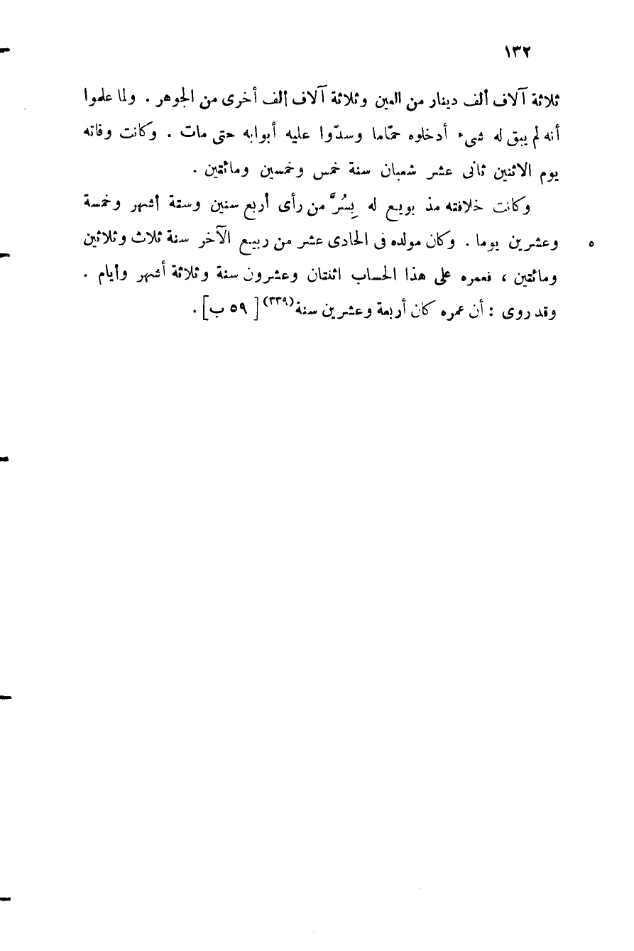 ثلاثة آلاف ألف دينار من العين وثلاثة آلاف ألف أخرى من الجوهر. ولما علموا أنه لم يبق له شيء أدخلوه حمّاما وسدّوا عليه أبوابه حتى مات. وكانت وفاته يوم الاثنين ثانى عشر شعبان سنة خمس وخمسين ومائتين.