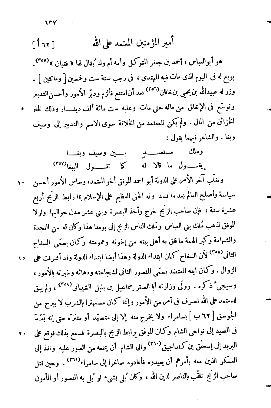 وتغلّب آخر الأمر على الدولة أبو أحمد الموفق أخو المعتمد، وساس الأمور أحسن سياسة وأصلح العالم بعد ما فسد وله الحق العظيم على الإسلام بما رابط الزنج أربع عشرة سنة، فإن صاحب الزنج خرج وأخذ البصرة وبنى عشر مدن حواليها ولولا الموفق لذهب ملك بنى العباس وملك الناس الزنج إلى يومنا هذا وكان له من النجدة والشهامة وكبر الهمة ما فاق به أهل بيته من إخوته وعمومته وكان يسمّى السفاح الثاني «358» لأن السفاح كان ابتداء الدولة وهذا أيضا ابتداء الدولة وقد أشرفت على الزوال. وكان ابنه المعتضد يسمّى المنصور الثاني لشجاعته ودهائه وخبرته بالأمور، وسيجيء ذكره. وولّى وزارته أبا الصقر إسماعيل بن بلبل الشيباني «359» ، ولم يبق للمعتمد على الله تصرف في أمر من الأمور وإنما كان مستهترا بالشرب لا يبرح من الجوسق [62 ب] بسامراء ولا يخرج منه إلا إلى متصيّد أو متنزّه حتى إنه بعد في الصيد إلى نواحي الشام وكان الموفق يرابط الزنج بالبصرة فسمع بذلك فوقع على البريد إلى إسحاق بن كنداجيق «360» والى الشام أن يمنعه من العبور عليه ونفذ إلى العسكر الذين معه يأمرهم أن يعيدوه فأعادوه صاغرا إلى سامراء «361» . وحين قتل صاحب الزنج تلقّب بالناصر لدين الله، وكان بلى بشيء لو بلى به المنصور أو المأمون