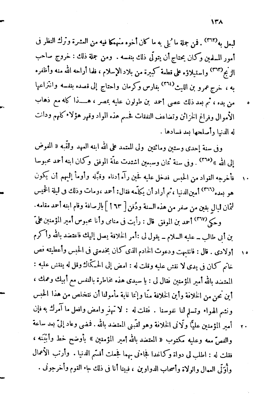 وفي سنة إحدى وستين ومائتين ولى المعتمد على الله ابنه العهد ولقّبه «المفوض إلى الله» «365» . وفي سنة ثمان وسبعين اشتدت علّة الموفق وكان ابنه أحمد محبوسا فأخرجه القواد من الحبس فدخل عليه فحين رآه أدناه وقبّله وأومأ إليهم أن يكون هو بعده «366» أمين الدنيا، ثم أراد أن يكلّمه فقال: أحمد، ومات وذلك في ليلة الخميس لثمان ليال بقين من صفر من هذه السنة ودفن [63 أ] بالرصافة وقام ابنه أحمد مقامه.