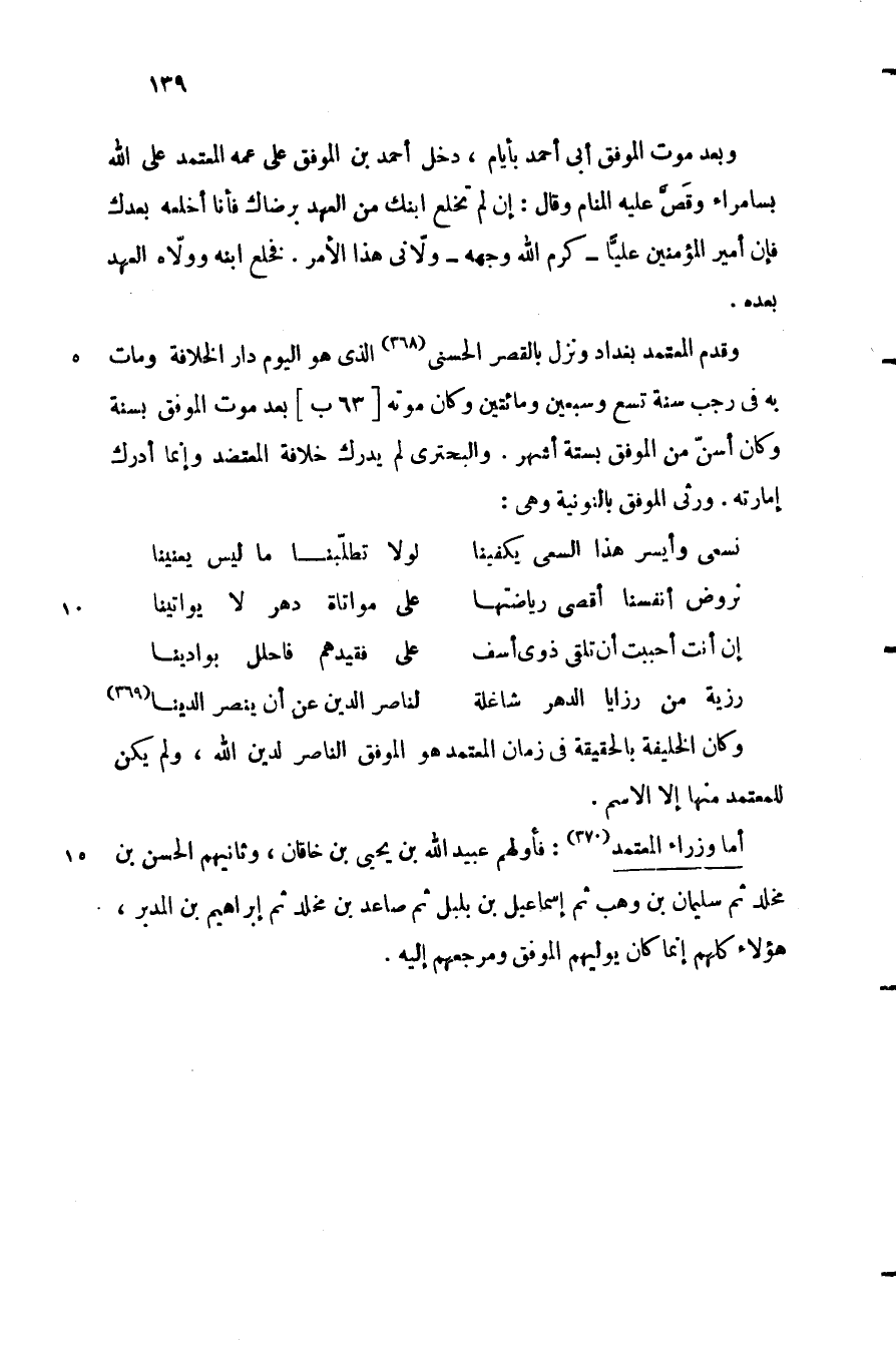 وقدم المعتمد بغداد ونزل بالقصر الحسنى «368» الّذي هو اليوم دار الخلافة ومات به في رجب سنة تسع وسبعين ومائتين وكان موته [63 ب] بعد موت الموفق بسنة وكان أسنّ من الموفق بستة أشهر. والبحتري لم يدرك خلافة المعتضد وإنما أدرك إمارته. ورثى الموفق بالنونية وهي: