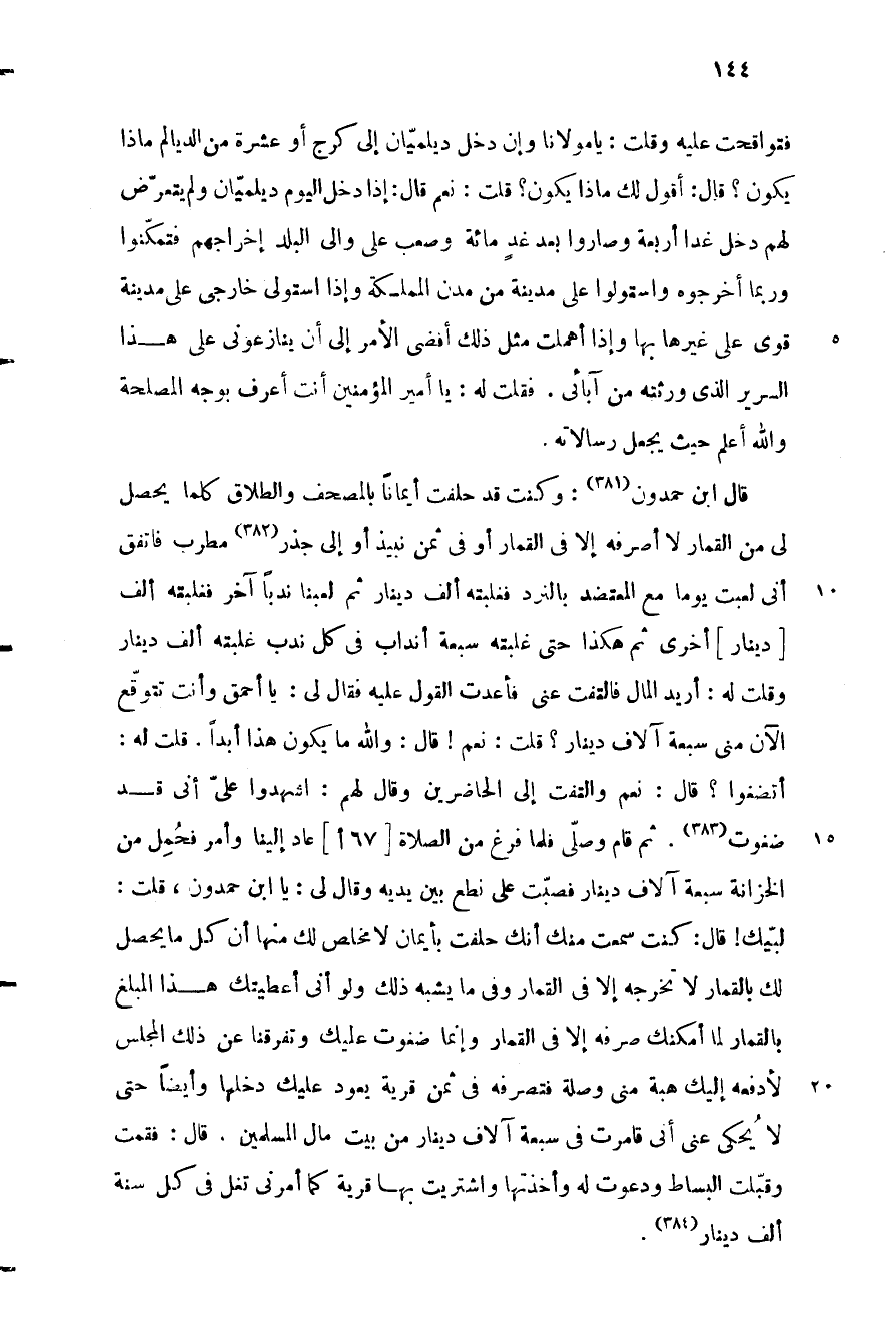 لبّيك! قال: كنت سمعت منك أنك حلفت بأيمان لا مخلص لك منها أن كل ما يحصل لك بالقمار لا تخرجه إلا في القمار وفي ما يشبه ذلك ولو أنى أعطيتك هذا المبلغ بالقمار لما أمكنك صرفه إلا في القمار وإنما ضغوت عليك وتفرقنا عن ذلك المجلس لأدفعه إليك هبة منى وصلة فتصرفه في ثمن قرية يعود عليك دخلها وأيضا حتى لا يحكى عنى أنى قامرت في سبعة آلاف دينار من بيت مال المسلمين. قال: فقمت وقبّلت البساط ودعوت له وأخذتها واشتريت بها قرية كما أمرنى تغل في كل سنة ألف دينار «384» .