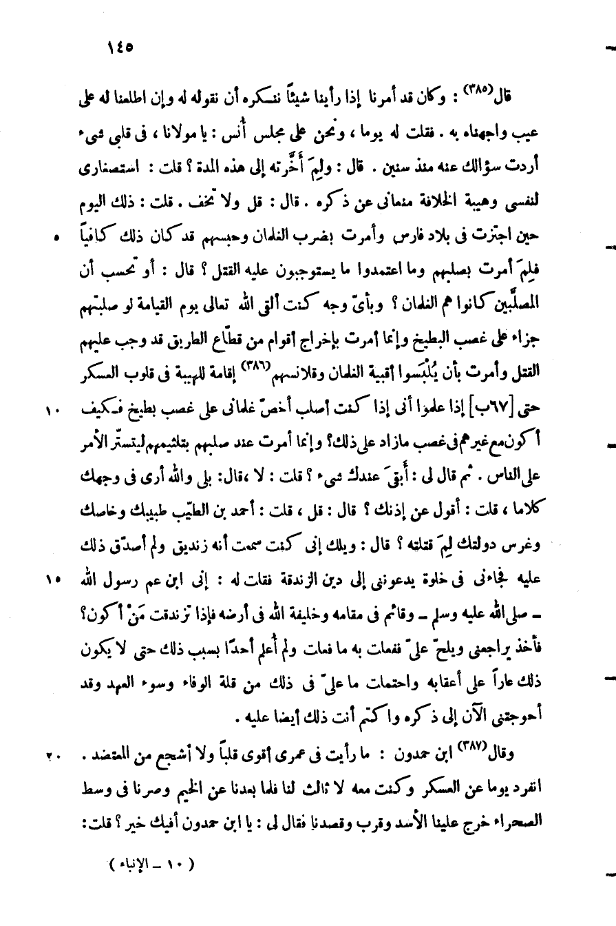 قال «385» : وكان قد أمرنا إذا رأينا شيئا ننكره أن نقوله له وإن أطلعنا له على عيب واجهناه به. فقلت له يوما، ونحن على مجلس أنس: يا مولانا، في قلبي شيء أردت سؤالك عنه منذ سنين. قال: ولم أخّرته إلى هذه المدة؟ قلت: استصغاري لنفسي وهيبة الخلافة منعانى عن ذكره. قال: قل ولا تخف. قلت: ذلك اليوم حين اجتزت في بلاد فارس وأمرت بضرب الغلمان وحبسهم قد كان ذلك كافيا فلم أمرت بصلبهم وما اعتمدوا ما يستوجبون عليه القتل؟ قال: أو تحسب أن المصلّبين كانوا هم الغلمان؟ وبأىّ وجه كنت ألقى الله تعالى يوم القيامة لو صلبتهم جزاء على غصب البطيخ وإنما أمرت بإخراج أقوام من قطّاع الطريق قد وجب عليهم القتل وأمرت بأن يلبسوا أقبية الغلمان وقلانسهم «386» إقامة للهيبة في قلوب العسكر حتى [67 ب] إذا علموا أنى إذا كنت أصلب أخصّ غلماني على غصب بطيخ فكيف أكون مع غيرهم في غصب ما زاد على ذلك؟ وإنما أمرت عند صلبهم بتلثيمهم ليتستّر الأمر على الناس. ثم قال لي: أبقى عندك شيء؟ قلت: لا، قال: بلى والله أرى في وجهك كلاما، قلت: أقول عن إذنك؟ قال: قل، قلت: أحمد بن الطيّب طبيبك وخاصك وغرس دولتك لم قتلته؟ قال: ويلك إني كنت سمعت أنه زنديق ولم أصدّق ذلك عليه فجاءني في خلوة يدعونني إلى دين الزندقة فقلت له: إني ابن عم رسول الله- صلّى الله عليه وسلم- وقائم في مقامه وخليفة الله في أرضه فإذا تزندقت من أكون؟