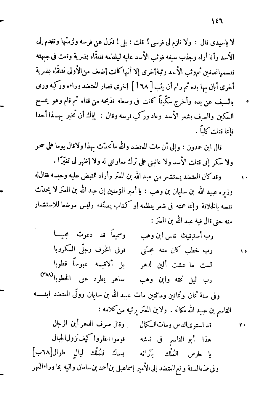 لا يا سيدي قال: ولا تلزم لي فرسي؟ قلت: بلى! فنزل عن فرسه ولزمتها وتقدم إلى الأسد وأنا أراه وجذب سيفه فوثب الأسد عليه ليلطمه فتلقّاه بضربة وقعت في جبهته فقسمها نصفين ثم وثب الأسد وثبة أخرى إلا أنها كانت أضعف من الأولى فتلقّاه بضربة أخرى أبان بها يده ثم رام أن يثب [68 أ] أخرى فصار المعتضد وراءه وركبه ورمى بالسيف عن يده وأخرج سكّينا كانت في وسطه فذبحه من قفاه ثم قام وهو يمسح السكين والسيف بشعر الأسد وعاد وركب فرسه وقال: إياك أن تخبر بهذا أحدا فإنما قتلت كلبا.