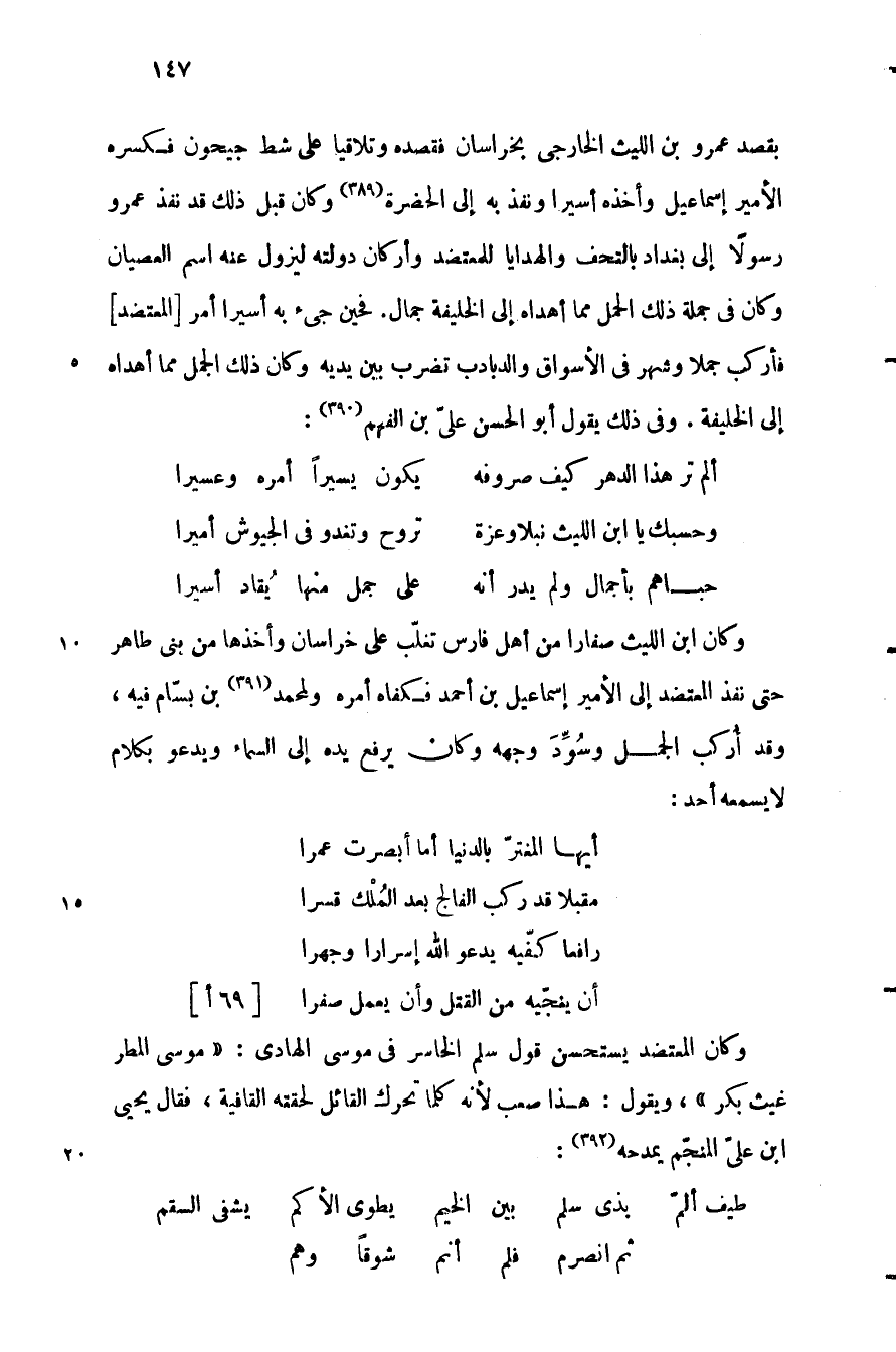 بقصد عمرو بن الليث الخارجي بخراسان فقصده وتلاقيا على شط جيحون فكسره الأمير إسماعيل وأخذه أسيرا ونفذ به إلى الحضرة «389» وكان قبل ذلك قد نفذ عمرو رسولا إلى بغداد بالتحف والهدايا للمعتضد وأركان دولته ليزول عنه اسم العصيان وكان في جملة ذلك الحمل مما أهداه إلى الخليفة جمال. فحين جيء به أسيرا أمر [المعتضد] فأركب جملا وشهر في الأسواق والدبادب تضرب بين يديه وكان ذلك الجمل مما أهداه إلى الخليفة. وفي ذلك يقول أبو الحسن عليّ بن الفهم «390» :