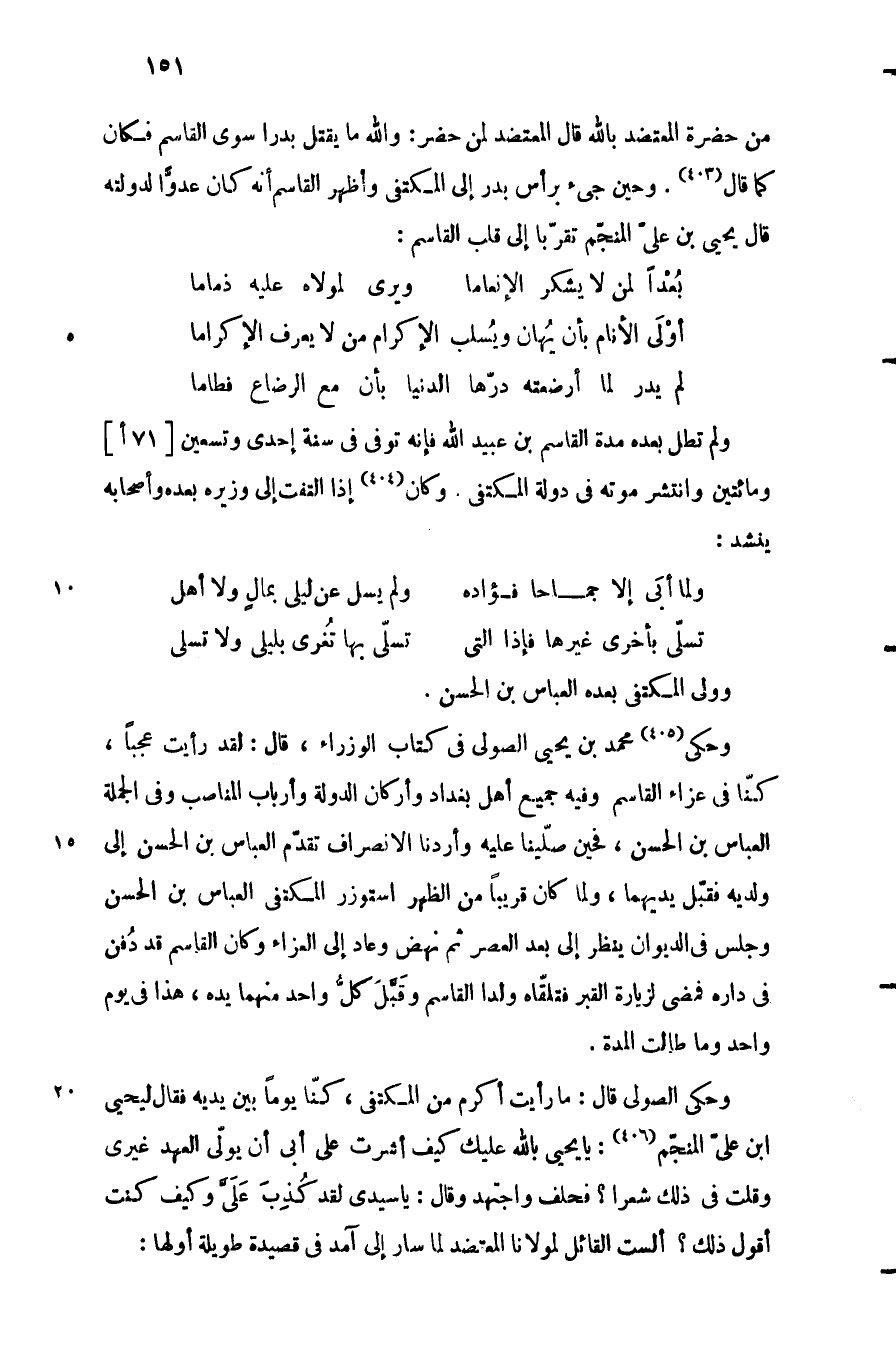 ولم تطل بعده مدة القاسم بن عبيد الله فإنه توفى في سنة إحدى وتسعين [71 أ] ومائتين وانتشر موته في دولة المكتفي. وكان «404» إذا التفت إلى وزيره بعده وأصحابه ينشد: