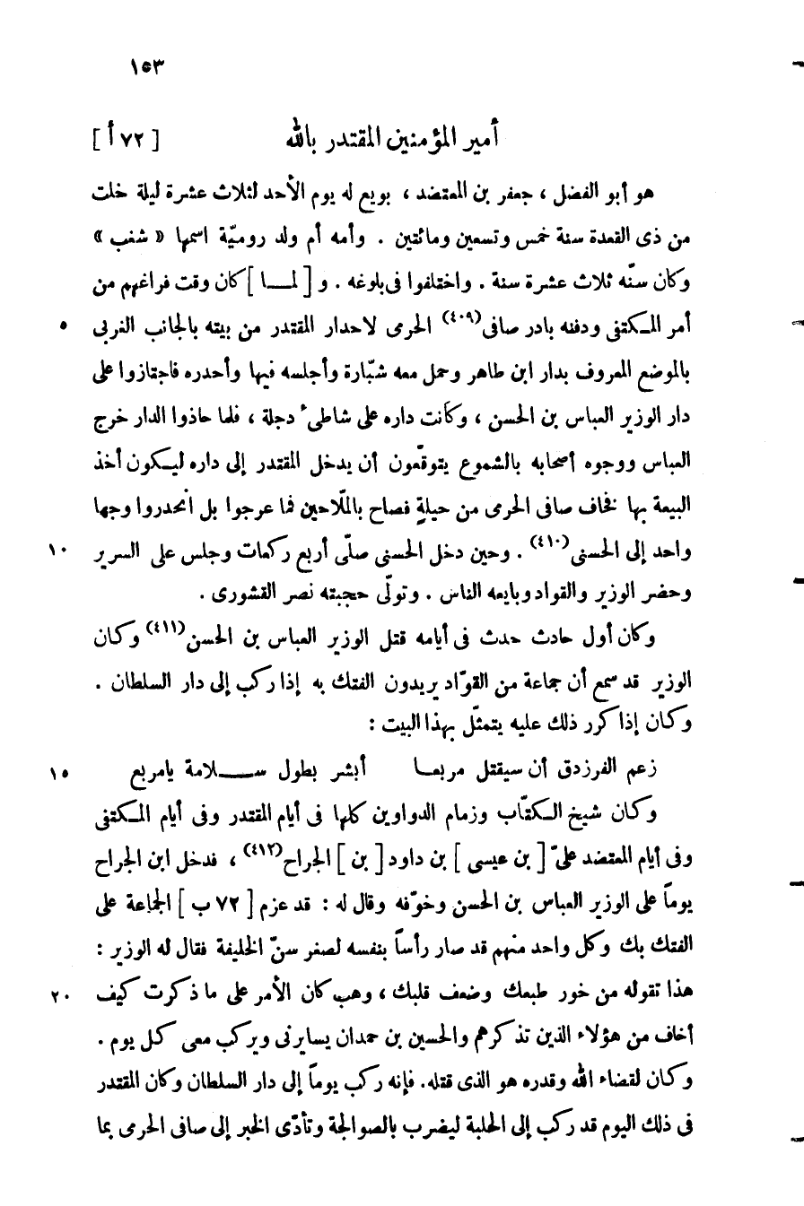 [72 أ] هو أبو الفضل، جعفر بن المعتضد، بويع له يوم الأحد لثلاث عشرة ليلة خلت من ذي القعدة سنة خمس وتسعين ومائتين. وأمه أم ولد روميّة اسمها «شغب» وكان سنّه ثلاث عشرة سنة. واختلفوا في بلوغه. و [لما] كان وقت فراغهم من أمر المكتفي ودفنه بادر صافى «409» الحرمي لاحدار المقتدر من بيته بالجانب الغربي بالموضع المعروف بدار ابن طاهر وحمل معه شبّارة وأجلسه فيها وأحدره فاجتازوا على دار الوزير العباس بن الحسن، وكانت داره على شاطئ دجلة، فلما حاذوا الدار خرج العباس ووجوه أصحابه بالشموع يتوقّعون أن يدخل المقتدر إلى داره ليكون أخذ البيعة بها فخاف صافى الحرمي من حيلة فصاح بالملّاحين فما عرجوا بل انحدروا وجها واحد إلى الحسنى «410» . وحين دخل الحسنى صلّى أربع ركعات وجلس على السرير وحضر الوزير والقواد وبايعه الناس. وتولّى حجبته نصر القشوري.