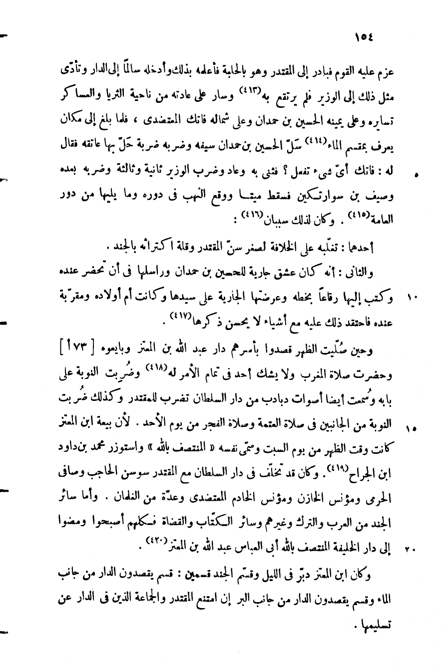 وحين صلّيت الظهر قصدوا بأسرهم دار عبد الله بن المعتز وبايعوه [73 أ] وحضرت صلاة المغرب ولا يشك أحد في تمام الأمر له «418» وضربت النوبة على بابه وسمعت أيضا أصوات دبادب من دار السلطان تضرب للمقتدر وكذلك ضربت النوبة من الجانبين في صلاة العتمة وصلاة الفجر من يوم الأحد. لأن بيعة ابن المعتز كانت وقت الظهر من يوم السبت وسمّى نفسه «المنتصف باللَّه» واستوزر محمد بن داود ابن الجراح «419» . وكان قد تخلّف في دار السلطان مع المقتدر سوسن الحاجب وصافى الحرمي ومؤنس الخازن ومؤنس الخادم المعتضدي وعدّة من الغلمان. وأما سائر الجند من العرب والترك وغيرهم وسائر الكتّاب والقضاة فكلهم أصبحوا ومضوا إلى دار الخليفة المنتصف باللَّه أبى العباس عبد الله بن المعتز «420» .