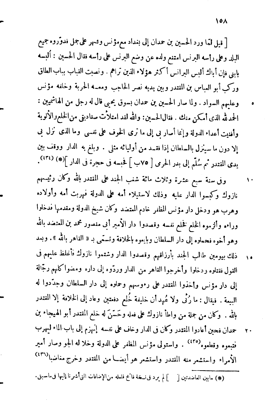 [قيل لمّا ورد الحسين بن حمدان إلى بغداد مع مؤنس وشهر على جمل فدوّروه جميع البلد وعلى رأسه البرنس امتنع ولده عن وضع البرنس على رأسه فقال الحسين: ألبسه يا بنى فإن أباك ألبس البرانس أكثر هؤلاء الذين تراهم. ونصبت القباب بباب الطاق وركب أبو العباس بن المقتدر وبين يديه نصر الحاجب ومعه الحربة وخلفه مؤنس وعليهم السواد. ولما صار الحسين بن حمدان بسوق يحيى قال له رجل من الهاشميين: