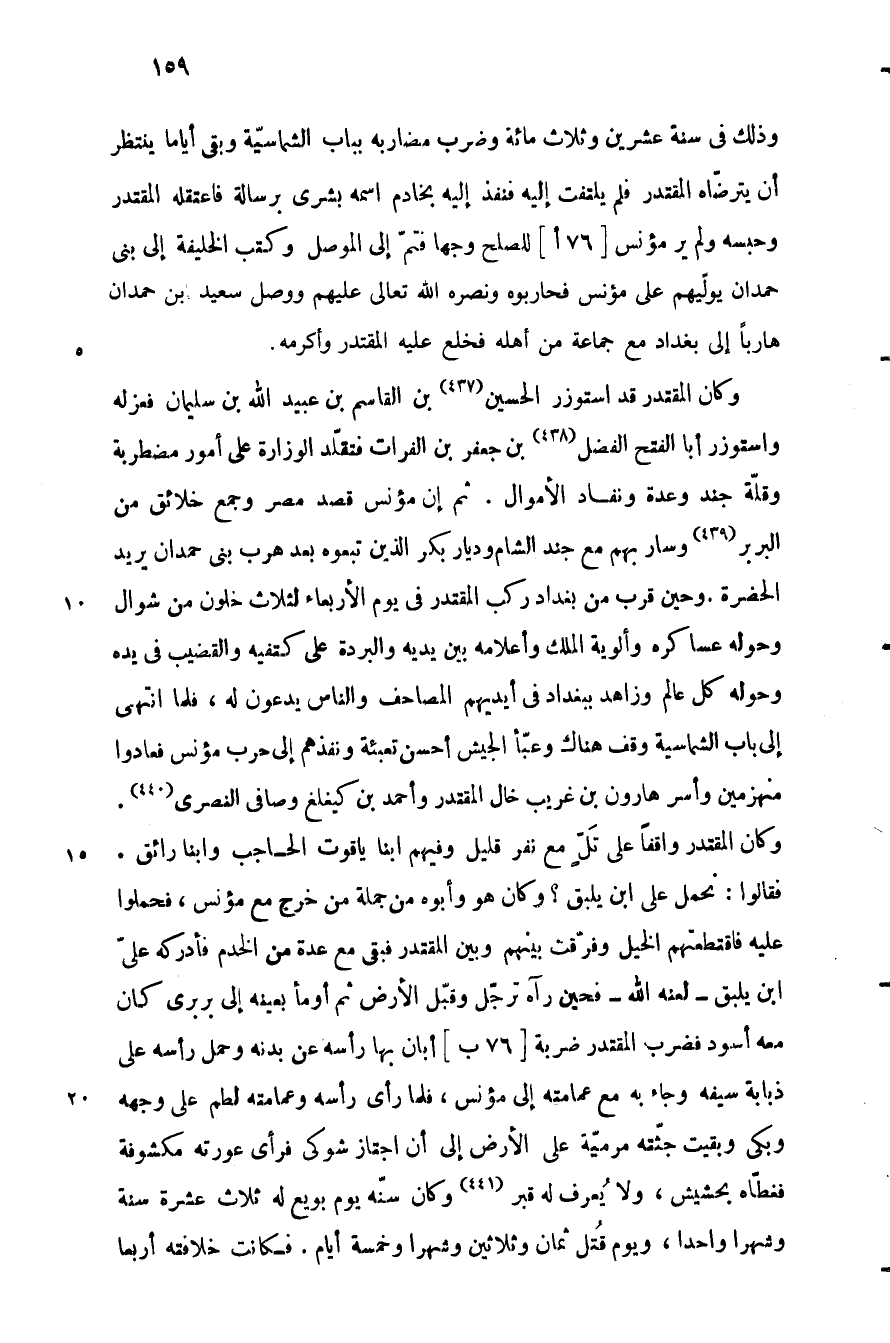وذلك في سنة عشرين وثلاث مائة وضرب مضاربه بباب الشماسيّة وبقي أياما ينتظر أن يترضّاه المقتدر فلم يلتفت إليه فنفذ إليه بخادم اسمه بشرى برسالة فاعتقله المقتدر وحبسه ولم ير مؤنس [76 أ] للصلح وجها فتمّ إلى الموصل وكتب الخليفة إلى بنى حمدان يولّيهم على مؤنس فحاربوه ونصره الله تعالى عليهم ووصل (سعيد) بن حمدان هاربا إلى بغداد مع جماعة من أهله فخلع عليه المقتدر وأكرمه.