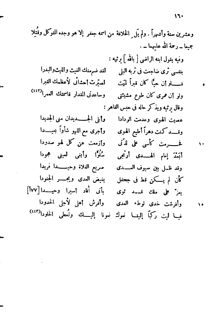 وعشرين سنة وأشهرا. ولم يل الخلافة من اسمه جعفر إلا هو وجده المتوكل وقتلا جميعا- رحمة الله عليهما-.