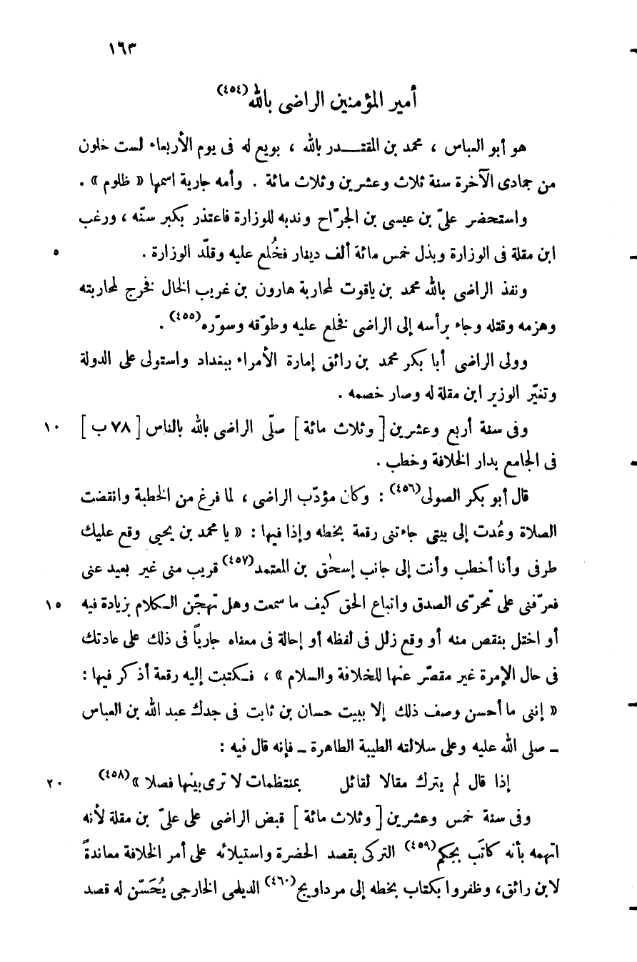 وفي سنة أربع وعشرين [وثلاث مائة] صلّى الراضي باللَّه بالناس [78 ب] في الجامع بدار الخلافة وخطب.