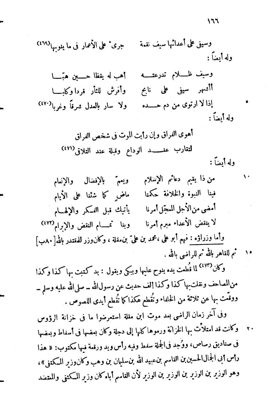 وكان «473» لما قطعت يده ينوح عليها ويبكى ويقول: يد كتبت بها كذا وكذا من المصاحف ونقلت بها كذا وكذا ألف حديث عن رسول الله- صلّى الله عليه وسلم- ووقّعت بها عن ثلاثة من الخلفاء وتقطع هكذا كما تقطع أيدي اللصوص.