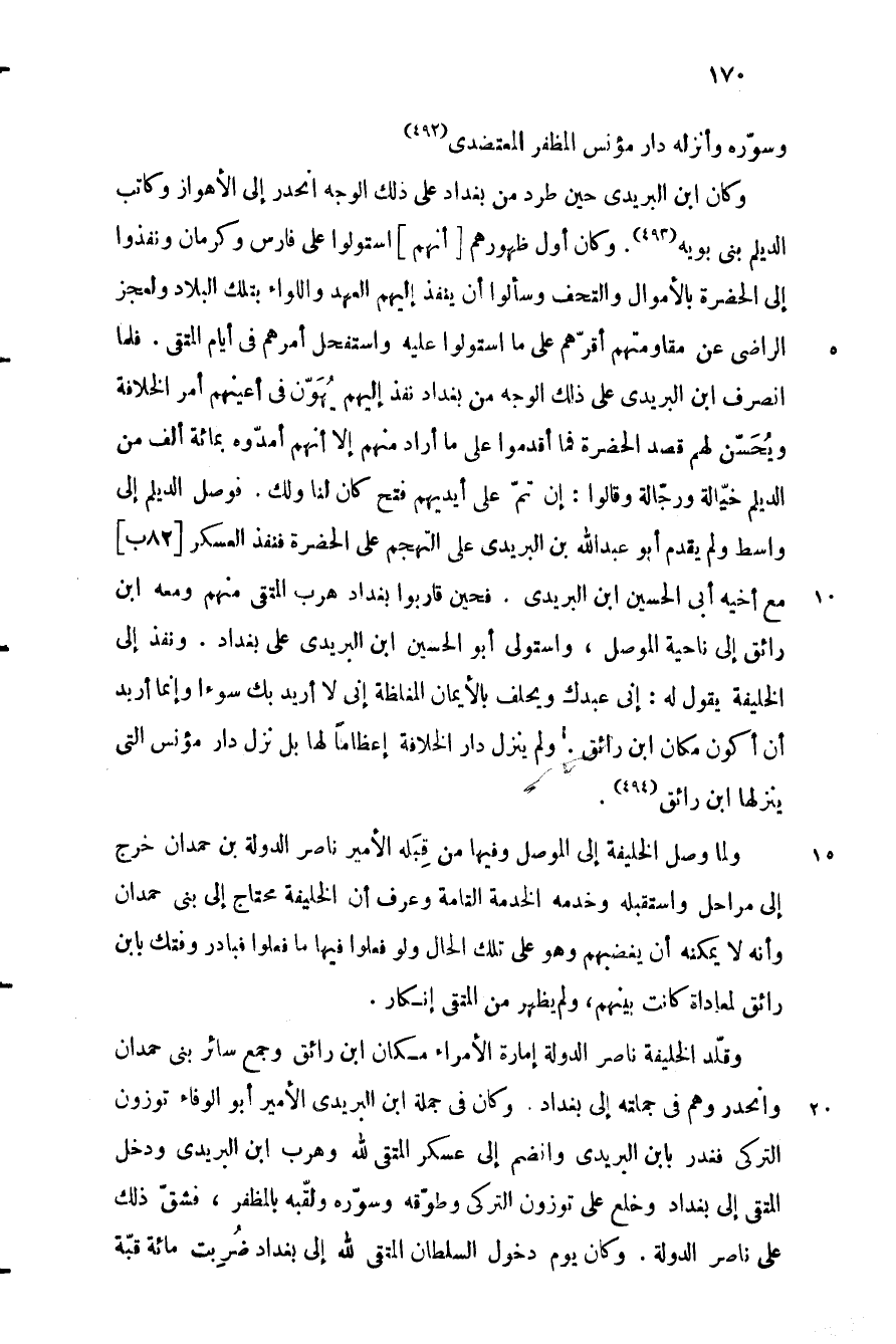 وكان ابن البريدي حين طرد من بغداد على ذلك الوجه انحدر إلى الأهواز وكاتب الديلم بنى بويه «493» . وكان أول ظهورهم [أنهم] استولوا على فارس وكرمان ونفذوا إلى الحضرة بالأموال والتحف وسألوا أن ينفذ إليهم العهد واللواء بتلك البلاد ولعجز الراضي عن مقاومتهم أقرّهم على ما استولوا عليه واستفحل أمرهم في أيام المتقى. فلما انصرف ابن البريدي على ذلك الوجه من بغداد نفذ إليهم يهوّن في أعينهم أمر الخلافة ويحسّن لهم قصد الحضرة فما أقدموا على ما أراد منهم إلا أنهم أمدّوه بمائة ألف من الديلم خيّالة ورجّالة وقالوا: إن تمّ على أيديهم فتح كان لنا ولك. فوصل الديلم إلى واسط ولم يقدم أبو عبد الله بن البريدي على التهجم على الحضرة فنفذ العسكر [82 ب] مع أخيه أبى الحسين ابن البريدي. فحين قاربوا بغداد هرب المتقى منهم ومعه ابن رائق إلى ناحية الموصل، واستولى أبو الحسين ابن البريدي على بغداد. ونفذ إلى الخليفة يقول له: إني عبدك ويحلف بالأيمان المغلظة إني لا أريد بك سوءا وإنما أربد أن أكون مكان ابن رائق. ولم ينزل دار الخلافة إعظاما لها بل نزل دار مؤنس التي ينزلها ابن رائق «494» .