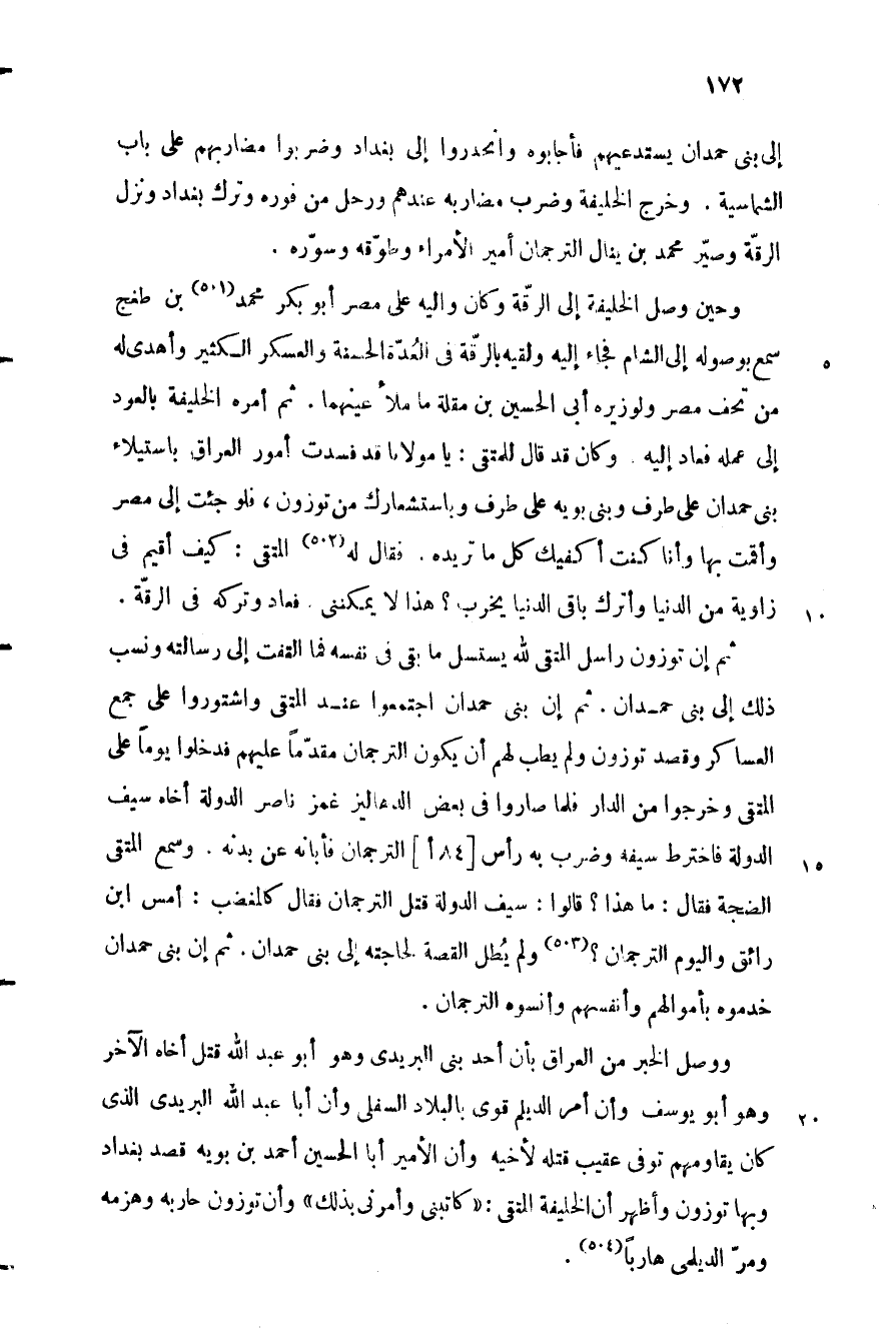 ثم إن توزون راسل المتقى للَّه يستسل ما بقي في نفسه فما التفت إلى رسالته ونسب ذلك إلى بنى حمدان. ثم إن بنى حمدان اجتمعوا عند المتقى واشتوروا على جمع العساكر وقصد توزون ولم يطب لهم أن يكون الترجمان مقدّما عليهم فدخلوا يوما على المتقى وخرجوا من الدار فلما صاروا في بعض الدهاليز غمز ناصر الدولة أخاه سيف الدولة فاخترط سيفه وضرب به رأس [84 أ] الترجمان فأبانه عن بدنه. وسمع المتقى الضجة فقال: ما هذا؟ قالوا: سيف الدولة قتل الترجمان فقال كالمغضب: أمس ابن رائق واليوم الترجمان؟ «503» ولم يطل القصة لحاجته إلى بنى حمدان. ثم إن بنى حمدان خدموه بأموالهم وأنفسهم وأنسوه الترجمان.