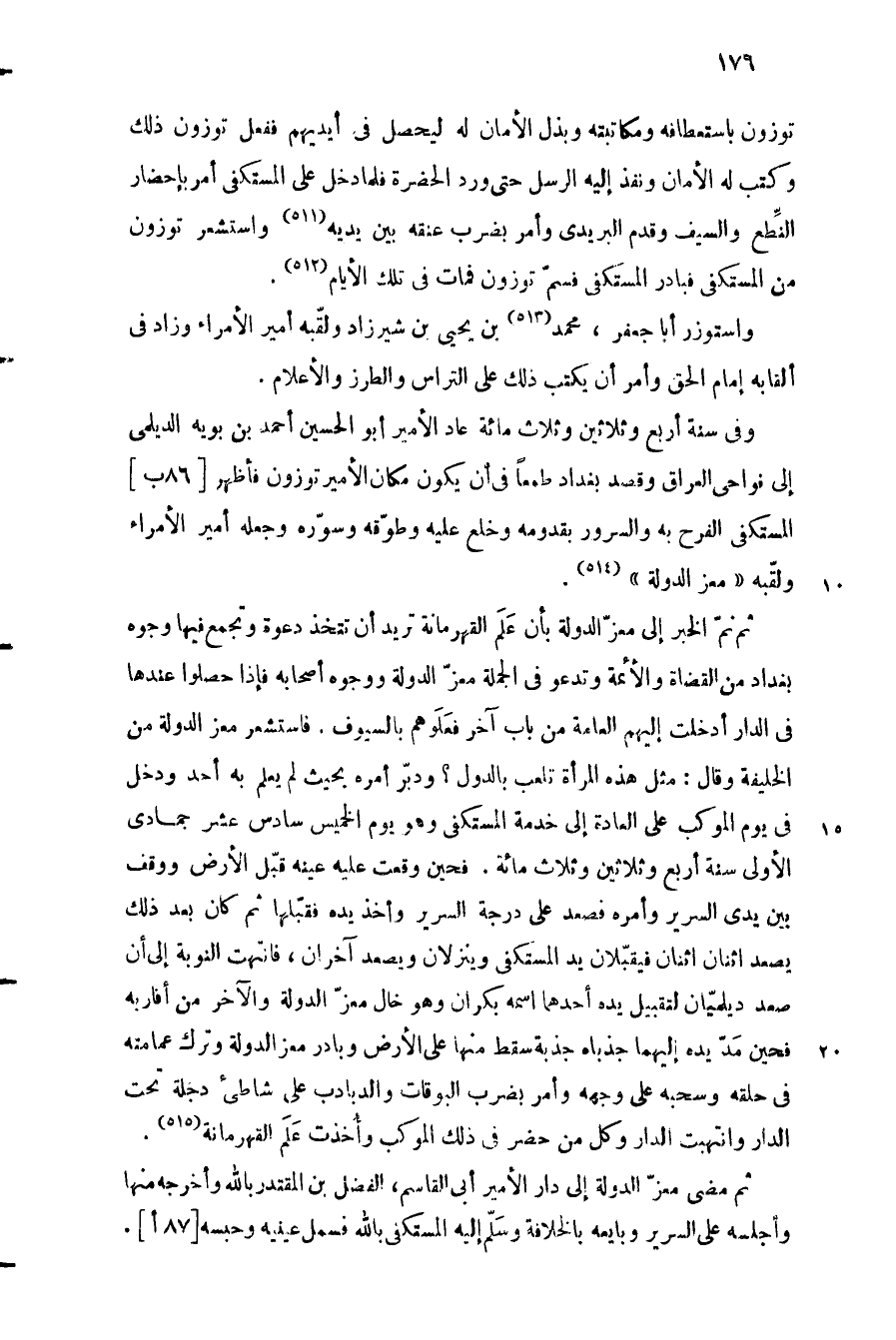 توزون باستعطافه ومكاتبته وبذل الأمان له ليحصل في أيديهم ففعل توزون ذلك وكتب له الأمان ونفذ إليه الرسل حتى ورد الحضرة فلما دخل على المستكفي أمر بإحضار النّطع والسيف وقدم البريدي وأمر بضرب عنقه بين يديه «511» واستشعر توزون من المستكفي فبادر المستكفي فسمّ توزون فمات في تلك الأيام «512» .