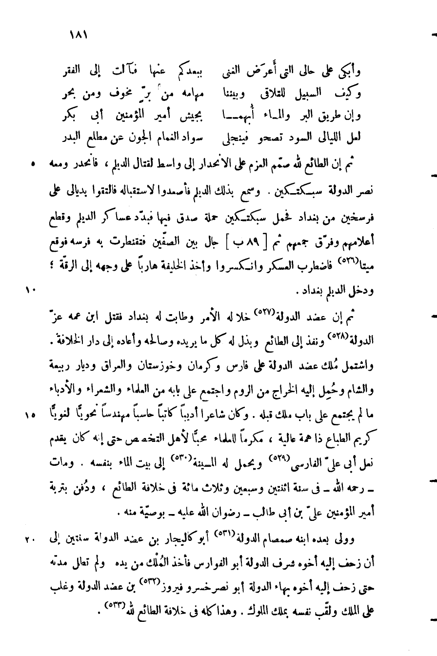 واشتمل ملك عضد الدولة على فارس وكرمان وخوزستان والعراق وديار ربيعة والشام وحمل إليه الخراج من الروم واجتمع على بابه من العلماء والشعراء والأدباء ما لم يجتمع على باب ملك قبله. وكان شاعرا أديبا كاتبا حاسبا مهندسا نحويّا لغويّا كريم الطباع ذا همة عالية، مكرما للعلماء محبّا لأهل التخصص حتى إنه كان يقدم نعل أبى عليّ الفارسي «529» ويحمل له المسينة «530» إلى بيت الماء بنفسه. ومات- رحمه الله- في سنة اثنتين وسبعين وثلاث مائة في خلافة الطائع، ودفن بتربة أمير المؤمنين عليّ بن أبى طالب- رضوان الله عليه- بوصيّة منه.