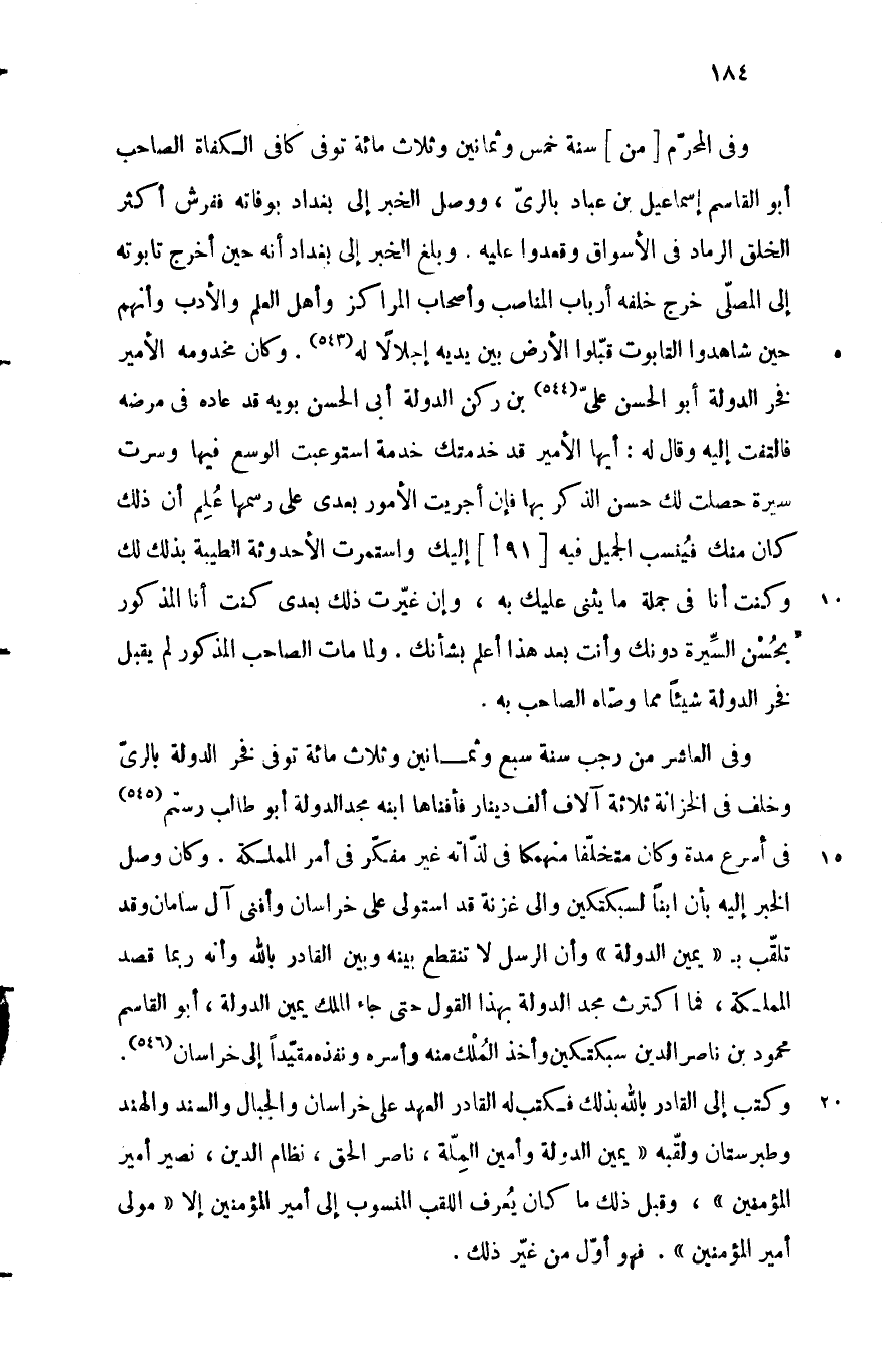 وفي المحرّم [من] سنة خمس وثمانين وثلاث مائة توفى كافى الكفاة الصاحب أبو القاسم إسماعيل بن عباد بالريّ، ووصل الخبر إلى بغداد بوفاته ففرش أكثر الخلق الرماد في الأسواق وقعدوا عليه. وبلغ الخبر إلى بغداد أنه حين أخرج تابوته إلى المصلّى خرج خلفه أرباب المناصب وأصحاب المراكز وأهل العلم والأدب وأنهم حين شاهدوا التابوت قبّلوا الأرض بين يديه إجلالا له «543» . وكان مخدومه الأمير فخر الدولة أبو الحسن عليّ «544» بن ركن الدولة أبى الحسن بويه قد عاده في مرضه فالتفت إليه وقال له: أيها الأمير قد خدمتك خدمة استوعبت الوسع فيها وسرت سيرة حصلت لك حسن الذكر بها فإن أجريت الأمور بعدي على رسمها علم أن ذلك كان منك فينسب الجميل فيه [91 أ] إليك واستمرت الأحدوثة الطيبة بذلك لك وكنت أنا في جملة ما يثنى عليك به، وإن غيّرت ذلك بعدي كنت أنا المذكور بحسن السّيرة دونك وأنت بعد هذا أعلم بشأنك. ولما مات الصاحب المذكور لم يقبل فخر الدولة شيئا مما وصّاه الصاحب به.