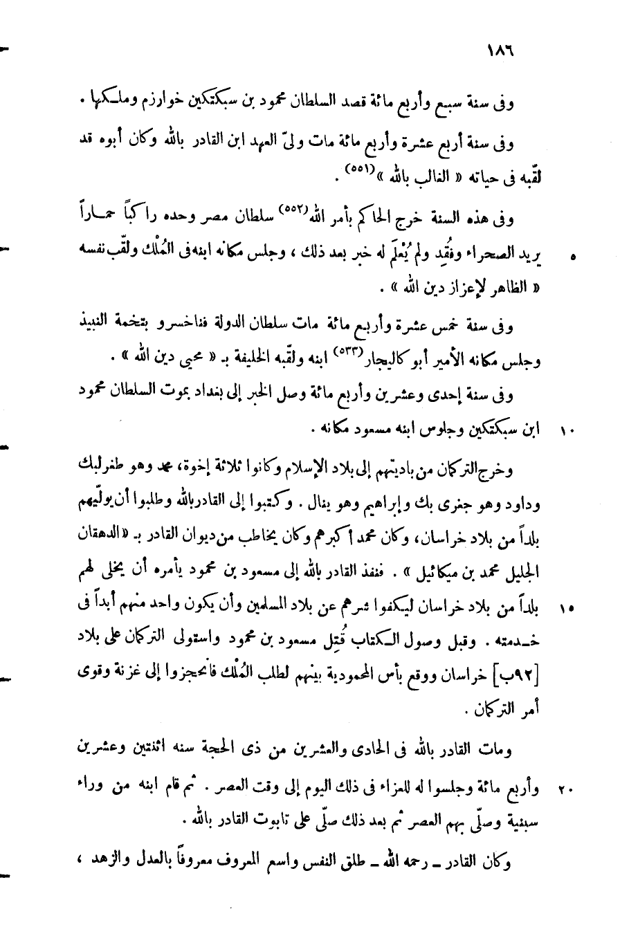 وخرج التركمان من باديتهم إلى بلاد الإسلام وكانوا ثلاثة إخوة، محمد وهو طغرلبك وداود وهو جغري بك وإبراهيم وهو ينال. وكتبوا إلى القادر باللَّه وطلبوا أن يولّيهم بلدا من بلاد خراسان، وكان محمد أكبرهم وكان يخاطب من ديوان القادر ب «الدهقان الجليل محمد بن ميكائيل» . فنفذ القادر باللَّه إلى مسعود بن محمود يأمره أن يخلى لهم بلدا من بلاد خراسان ليكفوا شرهم عن بلاد المسلمين وأن يكون واحد منهم أبدا في خدمته. وقبل وصول الكتاب قتل مسعود بن محمود واستولى التركمان على بلاد [92 ب] خراسان ووقع بأس المحمودية بينهم لطلب الملك فانحجزوا إلى غزنة وقوى أمر التركمان.