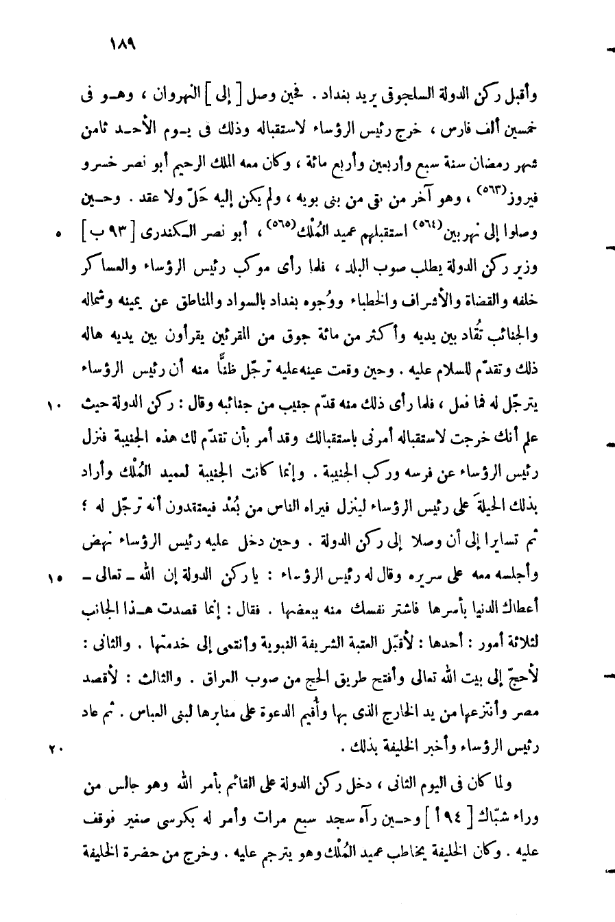 وأقبل ركن الدولة السلجوقي يريد بغداد. فحين وصل [إلى] النهروان، وهو في خمسين ألف فارس، خرج رئيس الرؤساء لاستقباله وذلك في يوم الأحد ثامن شهر رمضان سنة سبع وأربعين وأربع مائة، وكان معه الملك الرحيم أبو نصر خسرو فيروز «563» ، وهو آخر من بقي من بنى بويه، ولم يكن إليه حلّ ولا عقد. وحين وصلوا إلى نهربين «564» استقبلهم عميد الملك «565» ، أبو نصر الكندري [93 ب] وزير ركن الدولة يطلب صوب البلد، فلما رأى موكب رئيس الرؤساء والعساكر خلفه والقضاة والأشراف والخطباء ووجوه بغداد بالسواد والمناطق عن يمينه وشماله والجنائب تقاد بين يديه وأكثر من مائة جوق من المقرءين يقرءون بين يديه هاله ذلك وتقدّم للسلام عليه. وحين وقعت عينه عليه ترجّل ظنّا منه أن رئيس الرؤساء يترجّل له فما فعل، فلما رأى ذلك منه قدّم جنيب من جنائبه وقال: ركن الدولة حيث علم أنك خرجت لاستقباله أمرنى باستقبالك وقد أمر بأن تقدّم لك هذه الجنيبة فنزل رئيس الرؤساء عن فرسه وركب الجنيبة. وإنما كانت الجنيبة لعميد الملك وأراد بذلك الحيلة على رئيس الرؤساء لينزل فيراه الناس من بعد فيعتقدون أنه ترجّل له، ثم تسايرا إلى أن وصلا إلى ركن الدولة. وحين دخل عليه رئيس الرؤساء نهض وأجلسه معه على سريره وقال له رئيس الرؤساء: يا ركن الدولة إن الله- تعالى- أعطاك الدنيا بأسرها فاشتر نفسك منه ببعضها. فقال: إنما قصدت هذا الجانب لثلاثة أمور: أحدها: لأقبّل العتبة الشريفة النبويّة وأنتمي إلى خدمتها. والثاني: