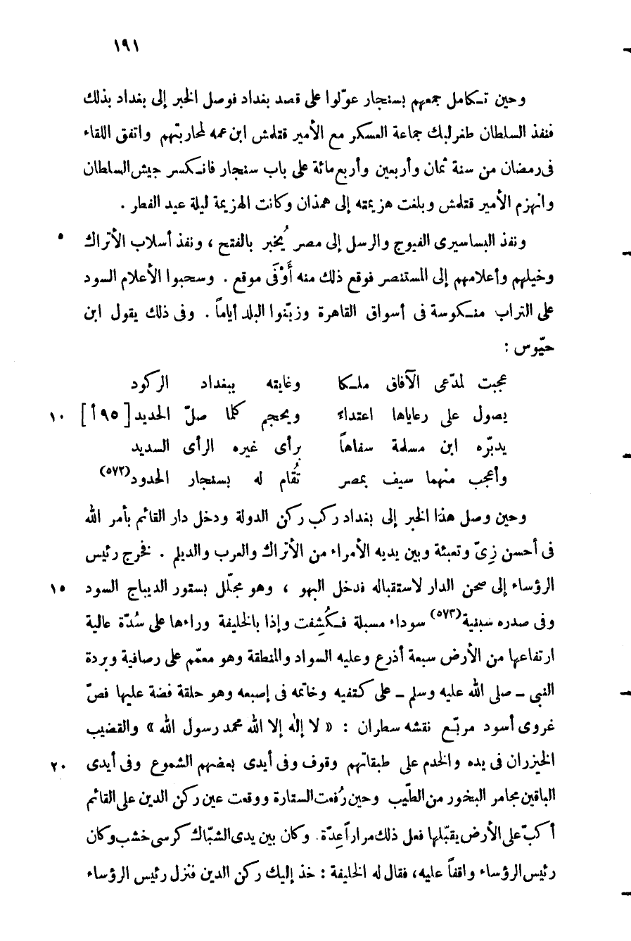 وأعجب منهما سيف بمصر ... تقام له بسنجار الحدود «572»