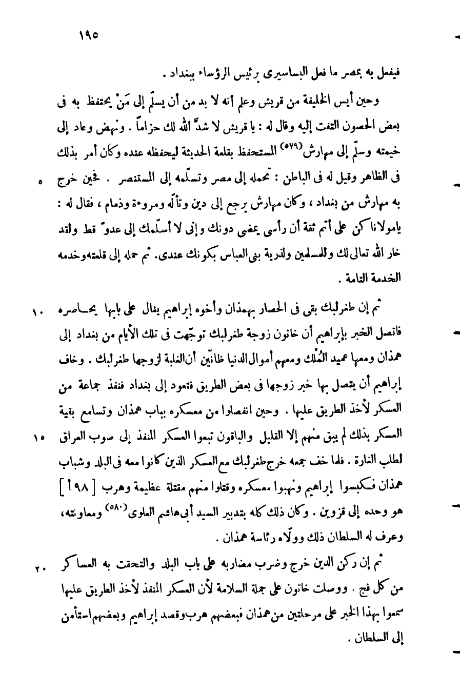 ثم إن طغرلبك بقي في الحصار بهمذان وأخوه إبراهيم ينال على بابها يحاصره فاتصل الخبر بإبراهيم أن خاتون زوجة طغرلبك توجّهت في تلك الأيام من بغداد إلى همذان ومعها عميد الملك ومعهم أموال الدنيا ظانّين أن الغلبة لزوجها طغرلبك. وخاف إبراهيم أن يتصل بها خبر زوجها في بعض الطريق فتعود إلى بغداد فنفذ جماعة من العسكر لأخذ الطريق عليها. وحين انفصلوا من معسكره بباب همذان وتسامع بقية العسكر بذلك لم يبق منهم إلا القليل والباقون تبعوا العسكر المنفذ إلى صوب العراق لطلب الغارة. فلما خف جمعه خرج طغرلبك مع العسكر الذين كانوا معه في البلد وشباب همذان فكبسوا إبراهيم ونهبوا معسكره وقتلوا منهم مقتلة عظيمة وهرب [98 أ] هو وحده إلى قزوين. وكان ذلك كله بتدبير السيد أبى هاشم العلويّ «580» ومعاونته، وعرف له السلطان ذلك وولّاه رئاسة همذان.