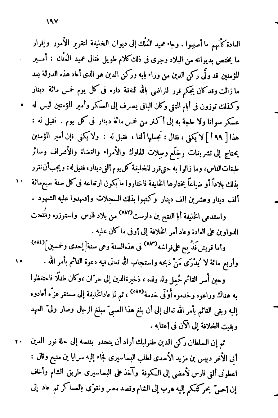 وحين أسر القائم حمل ولد ولده، ذخيرة الدين إلى حرّان، وكان طفلا فاحتفظوا به هناك وراعوه وخدموه أوفى خدمة «585» ، ثم لما عاد الخليفة إلى مستقر عزّه أعادوه إليه وبقي القائم بأمر الله تعالى إلى أن بلغ هذا الصبىّ مبلغ الرجال وصار ولىّ العهد وبقيت الخلافة إلى الآن في أعقابه.