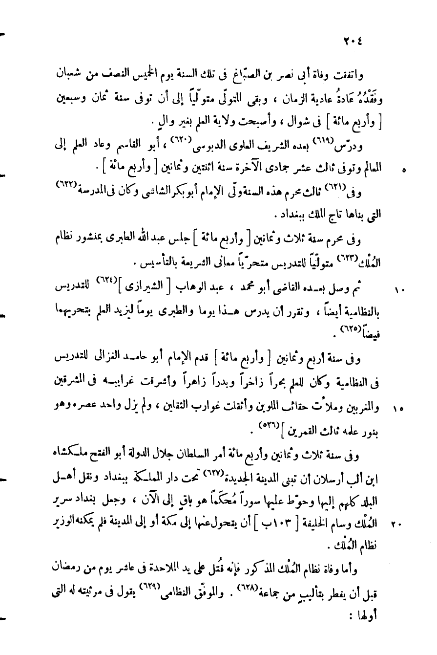 وفي محرم سنة ثلاث وثمانين [وأربع مائة] جلس عبد الله الطبري بمنشور نظام الملك «623» متولّيا للتدريس متحرّيا معاني الشريعة بالتأسيس.