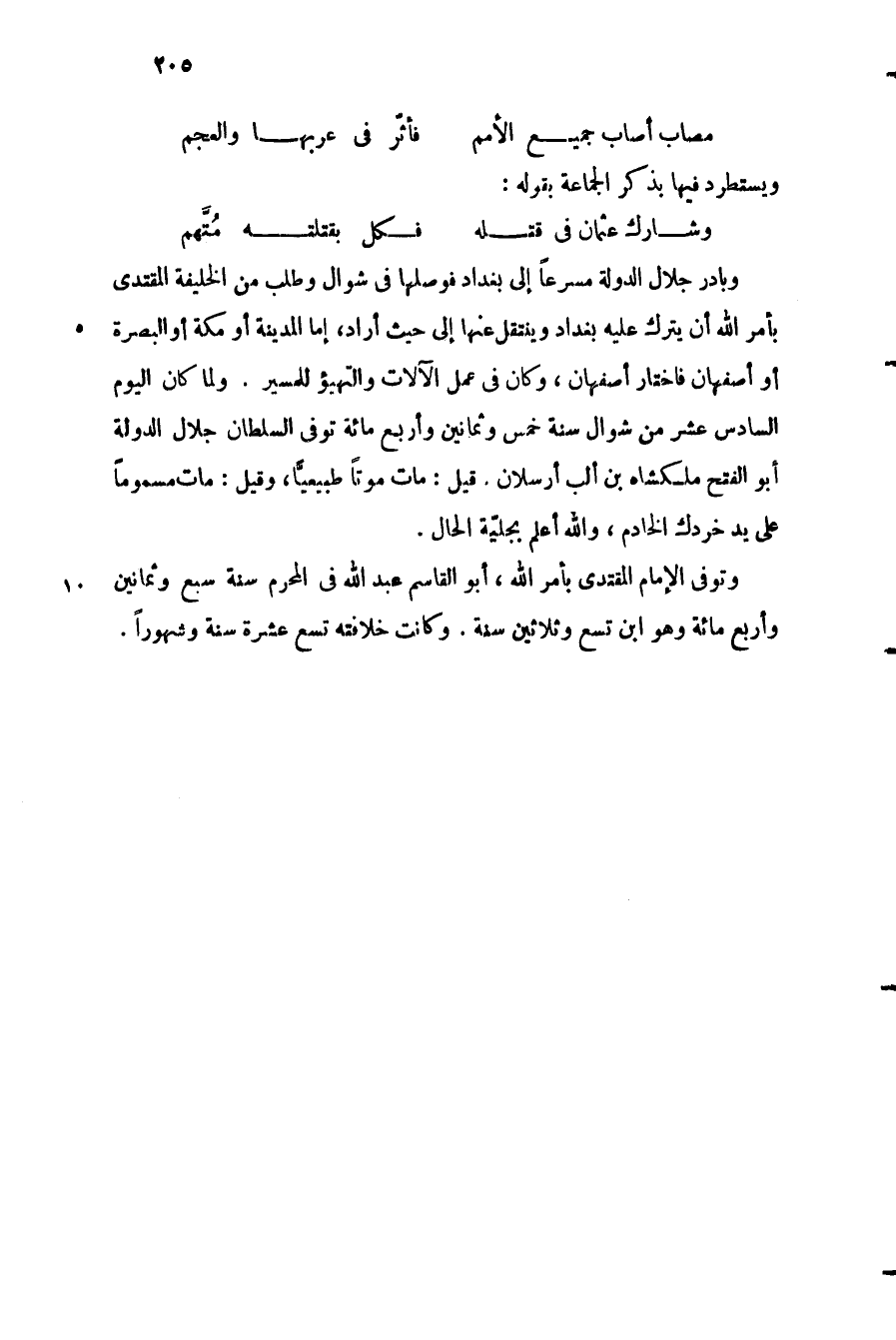 وتوفى الإمام المقتدى بأمر الله، أبو القاسم عبد الله في المحرم سنة سبع وثمانين وأربع مائة وهو ابن تسع وثلاثين سنة. وكانت خلافته تسع عشرة سنة وشهورا.