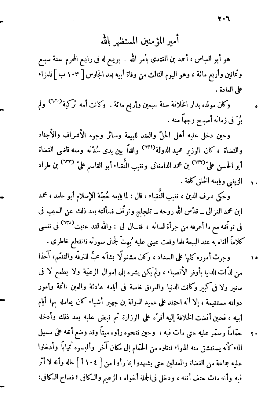 هو أبو العباس، أحمد بن المقتدى بأمر الله. بويع له في رابع المحرم سنة سبع وثمانين وأربع مائة، وهو اليوم الثالث من وفاة أبيه بعد الجلوس [103 ب] للعزاء على العادة.