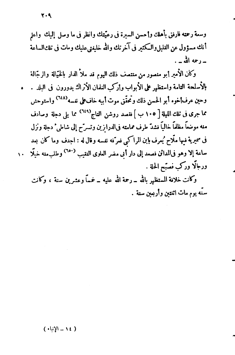 وحين عرف أخوه أبو الحسن ذلك وتحقّق موت أبيه خاف على نفسه «648» واستوحش مما جرى في تلك الليلة [105 ب] فقصد روشن التاج «649» مما يلي دجلة وصادف منه موضعا مظلما خاليا فشدّ طرف عمامته في الدرابزين وتسرّح إلى شاطئ دجلة ونزل في سميرية فيها ملّاح يعرف بابن المراكبي فعرّفه نفسه وقال له: اجدف وما كان بعد ساعة إلا وهو في المدائن فصعد إلى دار أبى مضر العلويّ النقيب «650» وطلب منه خيلا ورجالا وركب فصبّح الحلة.