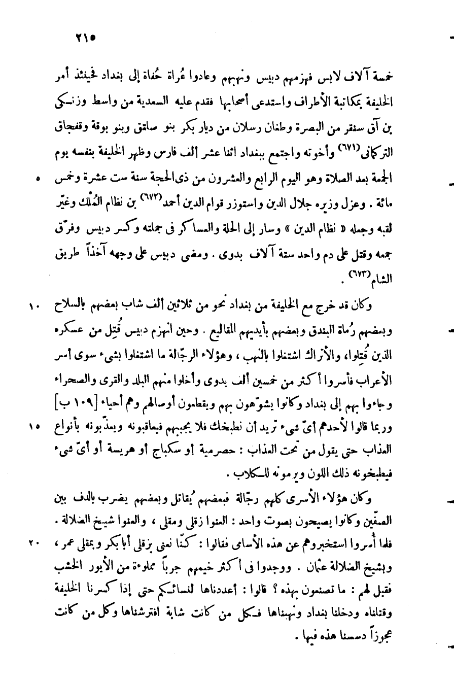وكان قد خرج مع الخليفة من بغداد نحو من ثلاثين ألف شاب بعضهم بالسلاح وبعضهم رماة البندق وبعضهم بأيديهم المقاليع. وحين انهزم دبيس قتل من عسكره الذين قتلوا، والأتراك اشتغلوا بالنهب، وهؤلاء الرجّالة ما اشتغلوا بشيء سوى أسر الأعراب فأسروا أكثر من خمسين ألف بدوي وأخلوا منهم البلد والقرى والصحراء وجاءوا بهم إلى بغداد وكانوا يشوّهون بهم ويقطعون أوصالهم وهم أحياء [109 ب] وربما قالوا لأحدهم أيّ شيء تريد أن نطبخك فلا يجيبهم فيعاقبونه ويعذّبونه بأنواع العذاب حتى يقول من تحت العذاب: حصرمية أو سكباج أو هريسة أو أيّ شيء فيطبخونه ذلك اللون ويرمونه للكلاب.