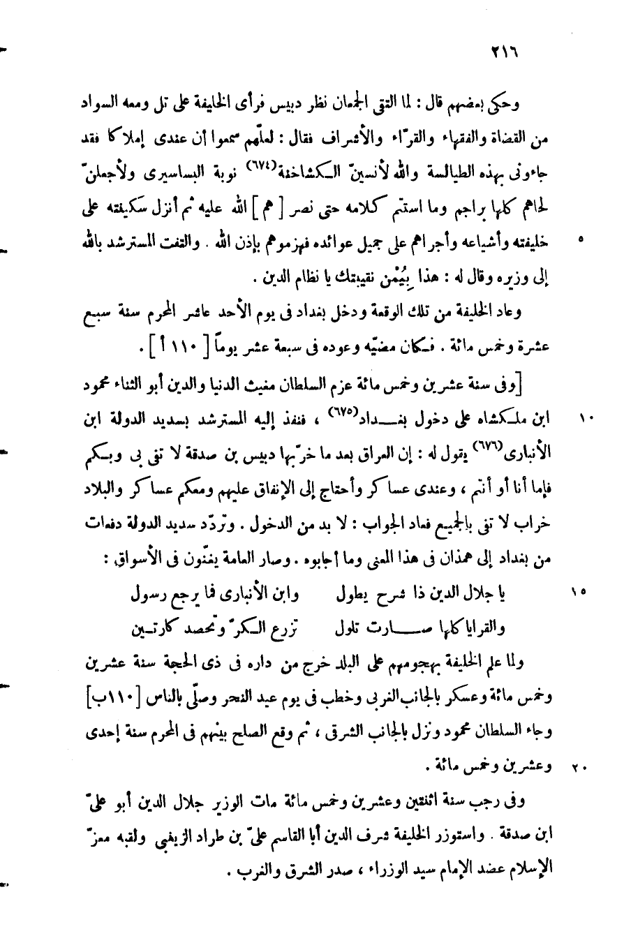 وعاد الخليفة من تلك الوقعة ودخل بغداد في يوم الأحد عاشر المحرم سنة سبع عشرة وخمس مائة. فكان مضيّه وعوده في سبعة عشر يوما [110 أ] .