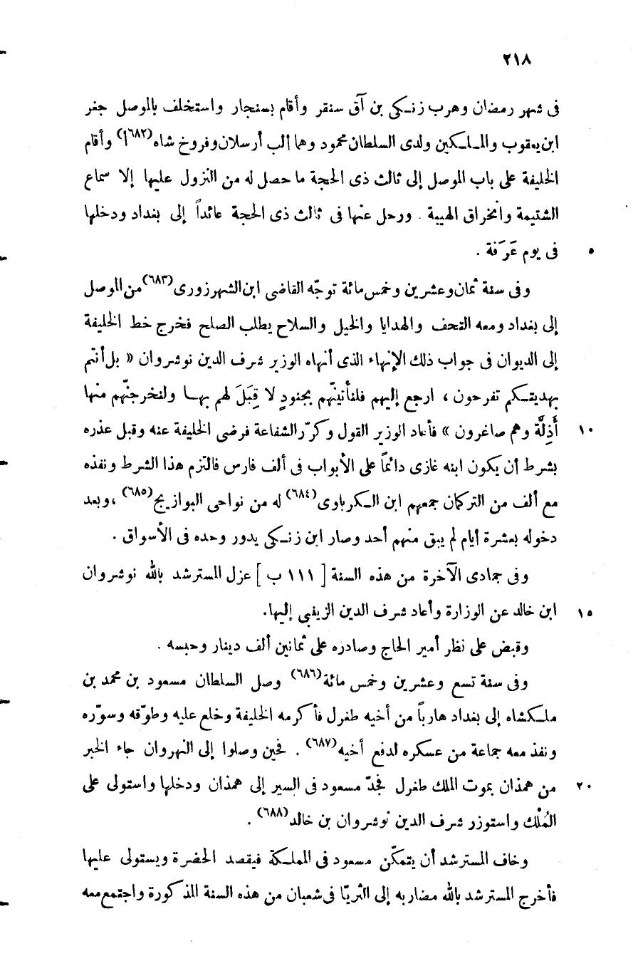 وفي سنة ثمان وعشرين وخمس مائة توجّه القاضي ابن الشهرزوريّ «683» من الموصل إلى بغداد ومعه التحف والهدايا والخيل والسلاح يطلب الصلح فخرج خط الخليفة إلى الديوان في جواب ذلك الإنهاء الّذي أنهاه الوزير شرف الدين نوشروان «بل أنتم بهديتكم تفرحون، ارجع إليهم فلنأتينّهم بجنود لا قبل لهم بها ولنخرجنّهم منها أذلّة وهم صاغرون» فأعاد الوزير القول وكرّر الشفاعة فرضى الخليفة عنه وقبل عذره بشرط أن يكون ابنه غازى دائما على الأبواب في ألف فارس فالتزم هذا الشرط ونفذه مع ألف من التركمان جمعهم ابن الكرباوى «684» له من نواحي البوازيج «685» ، وبعد دخوله بعشرة أيام لم يبق منهم أحد وصار ابن زنكي يدور وحده في الأسواق.