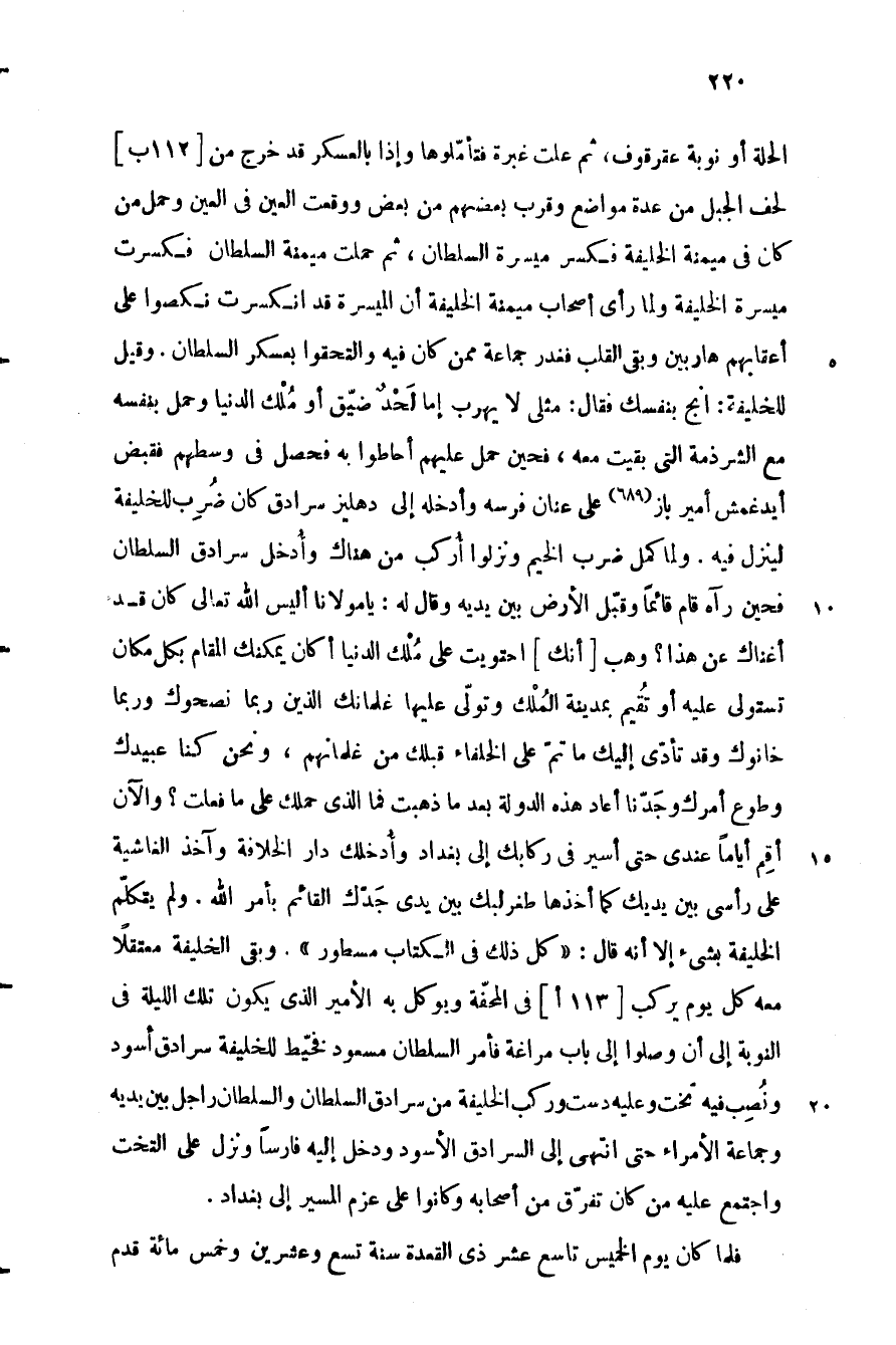 الحلة أو نوبة عقرقوف، ثم علت غبرة فتأمّلوها وإذا بالعسكر قد خرج من [112 ب] لحف الجبل من عدة مواضع وقرب بعضهم من بعض ووقعت العين في العين وحمل من كان في ميمنة الخليفة فكسر ميسرة السلطان، ثم حملت ميمنة السلطان فكسرت ميسرة الخليفة ولما رأى أصحاب ميمنة الخليفة أن الميسرة قد انكسرت نكصوا على أعقابهم هاربين وبقي القلب فغدر جماعة ممن كان فيه والتحقوا بعسكر السلطان. وقيل للخليفة: أنج بنفسك فقال: مثلي لا يهرب إما لحد ضيّق أو ملك الدنيا وحمل بنفسه مع الشرذمة التي بقيت معه، فحين حمل عليهم أحاطوا به فحصل في وسطهم فقبض آيدغمش أمير باز «689» على عنان فرسه وأدخله إلى دهليز سرادق كان ضرب للخليفة لينزل فيه. ولما كمل ضرب الخيم ونزلوا أركب من هناك وأدخل سرادق السلطان فحين رآه قام قائما وقبّل الأرض بين يديه وقال له: يا مولانا أليس الله تعالى كان قد أغناك عن هذا؟ وهب [أنك] احتويت على ملك الدنيا أكان يمكنك المقام بكل مكان تستولى عليه أو تقيم بمدينة الملك وتولّى عليها غلمانك الذين ربما نصحوك وربما خانوك وقد تأدّى إليك ما تمّ على الخلفاء قبلك من غلمانهم، ونحن كنا عبيدك وطوع أمرك وجدّنا أعاد هذه الدولة بعد ما ذهبت فما الّذي حملك على ما فعلت؟ والآن أقم أياما عندي حتى أسير في ركابك إلى بغداد وأدخلك دار الخلافة وآخذ الغاشية على رأسي بين يديك كما أخذها طغرلبك بين يدي جدّك القائم بأمر الله. ولم يتكلّم الخليفة بشيء إلا أنه قال: «كل ذلك في الكتاب مسطور» . وبقي الخليفة معتقلا معه كل يوم يركب [113 أ] في المحفّة ويوكل به الأمير الّذي يكون تلك الليلة في النوبة إلى أن وصلوا إلى باب مراغة فأمر السلطان مسعود فخيّط للخليفة سرادق أسود ونصب فيه تخت وعليه دست وركب الخليفة من سرادق السلطان والسلطان راجل بين يديه وجماعة الأمراء حتى انتهى إلى السرادق الأسود ودخل إليه فارسا ونزل على التخت واجتمع عليه من كان تفرّق من أصحابه وكانوا على عزم المسير إلى بغداد.