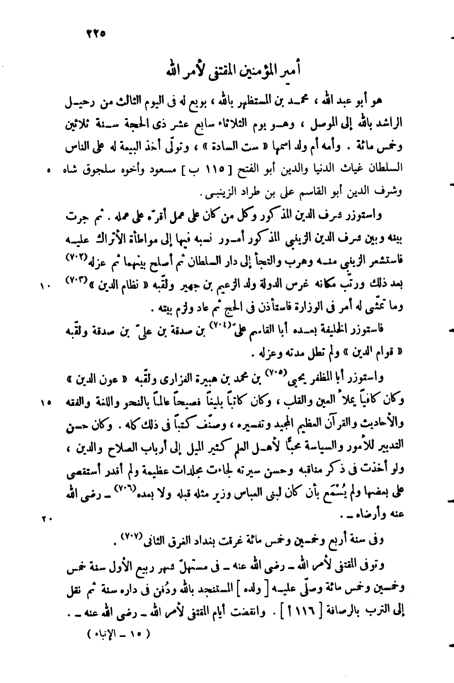 واستوزر أبا المظفر يحيى «705» بن محمد بن هبيرة الفزاري ولقّبه «عون الدين» وكان كافيا يملأ العين والقلب، وكان كاتبا بليغا فصيحا عالما بالنحو واللغة والفقه والأحاديث والقرآن العظيم المجيد وتفسيره، وصنّف كتبا في ذلك كله. وكان حسن التدبير للأمور والسياسة محبّا لأهل العلم كثير الميل إلى أرباب الصلاح والدين، ولو أخذت في ذكر مناقبه وحسن سيرته لجاءت مجلدات عظيمة ولم أقدر أستقصى على بعضها ولم يسمع بأن كان لبني العباس وزير مثله قبله ولا بعده «706» رضى الله عنه وأرضاه-.
