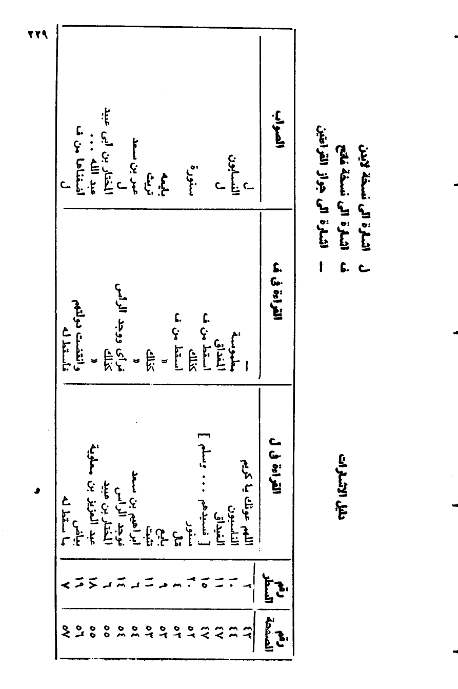 دليل الإشارات ل اشارة الى نسخة لايدن ف اشارة الى نسخة فاتح- اشارة الى جواز القراءتين رقم الصفحة/ رقم السطر/ القراءة في ل/ القراءة في ف/ الصواب 43/ 2/ اللَّهمّ عونك يا كريم/-/ ل 44/ 10/ الناسبون/ مطموسة/ النسابون 47/ 11/ الغيداق/ المغداق/ ل 47/ 15/ [فسيدهم ... وسلم] / اسقط من ف/ 52/ 20/ سنور/ كذلك/ سنورة 53/ 4/ قال/ اسقط من ف/ 53/ 9/ بايع/ «/ بايعه 53/ 11/ تثبت/ كذلك/ تريث 54/ 6/ إبراهيم بن سعد/ «/ عمر بن سعد 54/ 14/ فوجد الرأس/ فرأى ووجد الرأس/ ل 55/ 6/ المختار بن عبيد/ كذلك/ المختار بن أبى عبيد 55/ 18/ عبد العزيز بن معاوية/ «/ عبد الله ...