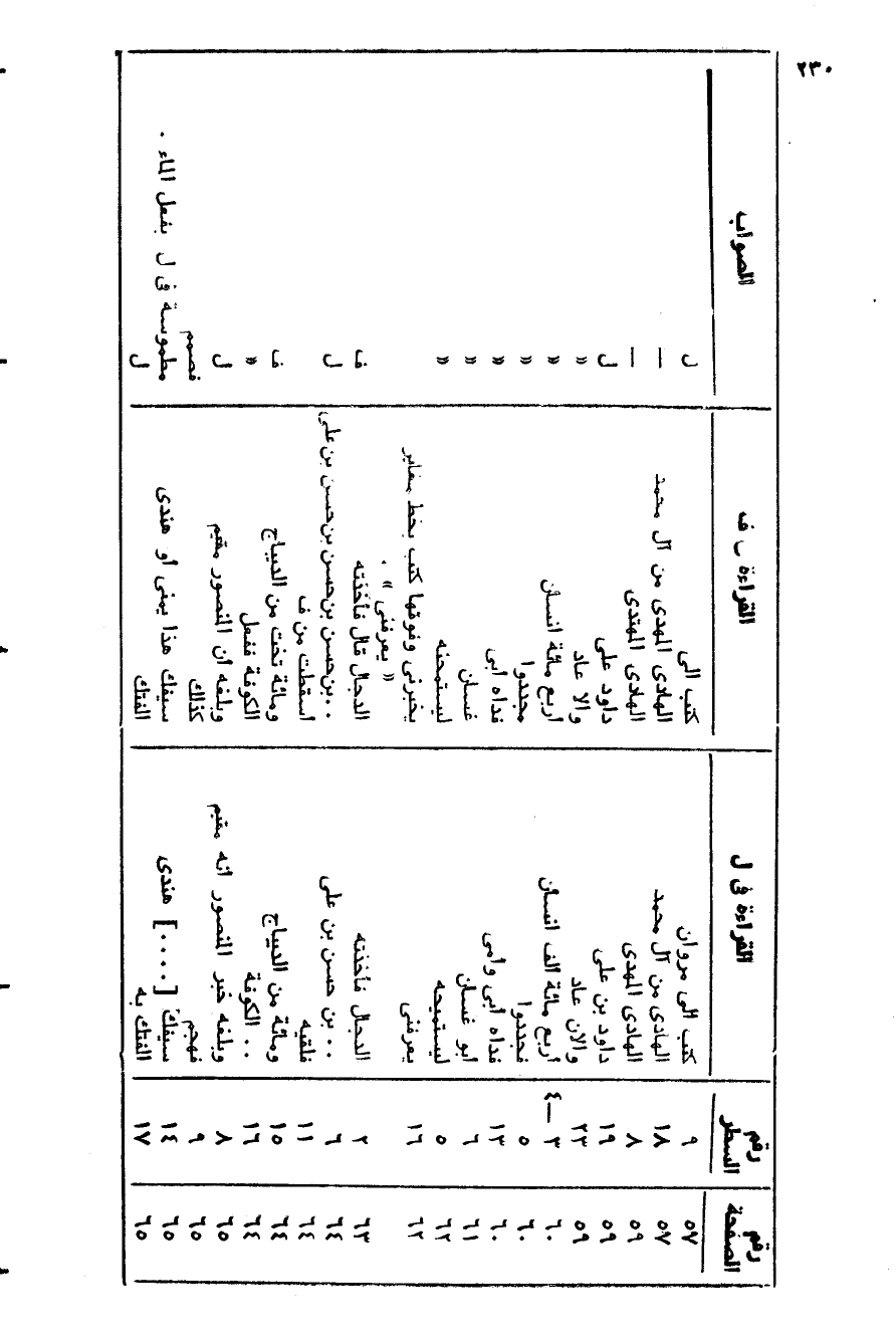 رقم الصفحة/ رقم السطر/ القراءة في ل/ القراءة في ف/ الصواب 57/ 9/ كتب الى مروان/ كتب الى/ ل 57/ 18/ الهادي من آل محمد/ الهادي المهدي من آل محمد/- 59/ 8/ الهادي المهدي/ الهادي المهتدي/- 59/ 19/ داود بن على/ داود على/ ل 59/ 23/ والان عاد/ والا عاد/ «60/ 3- 4/ أربع مائة ألف إنسان/ أربع مائة إنسان/ «60/ 5/ فجددوا/ مجددوا/ «60/ 13/ فداه أبى وأمى/ فداه أبى/ «61/ 6/ أبو غسان/ غسان/ «62/ 5/ ليستميحه/ ليستمحنه/ «62/ 16/ يعرفني/ يخبرني وفوقها كتب بخط مغاير «يعرفني» .