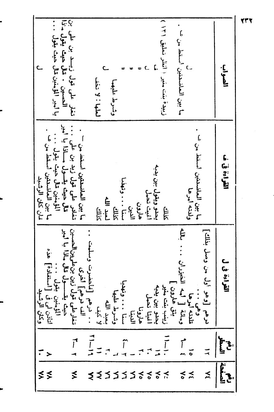 75/ 10- 11/ زينب بنت منير/ كذلك/ زبيدة بنت منير (انظر تعليق 131) 75/ 19/ يحدو بين يديه/ يحدو ويقول بين يديه/ ف 75/ 20/ أغيثا تحمل/ أغيث تحمل/ ل 75/ 20/ هارونا/ هارون/ «76/ 1/ الدينا/ الدين/ «76/ 3- 4/ سنا ... وتهديا/ سنا ... وتهذبا/ «76/ 6/ وشرط عليها/ كذلك/ وشرط عليهما 76/ 20/ بعبد الله/ لعبد الله/ ل 77/ 11/ لا كيف/ كذلك/ لعلها: لا تخف 77/ 19- 21/.. درهم [فأحضرت وسلمت.. ألف درهم] أخرى/ ما بين العاضدتين أسقط من.