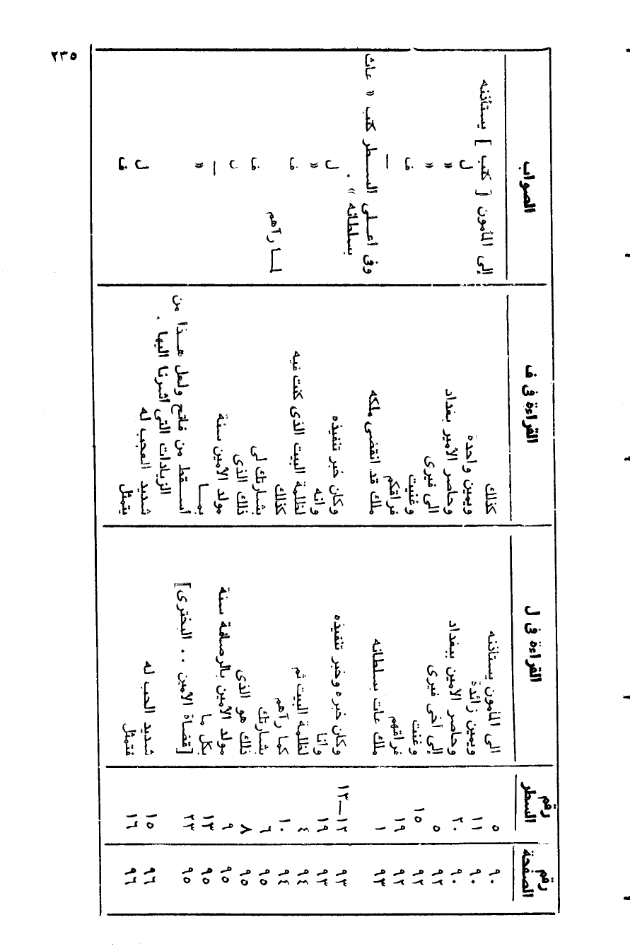 93/ 12- 13/ وكان خبره وخبر تنفيذه/ وكان خبر تنفيذه/ ل 93/ 19/ وأنا/ وأنه/ «94/ 4/ لظلمة البيت ثم/ لظلمة البيت الّذي كنت فيه/ ف 94/ 10/ كما رآهم/ كذلك/ لما رآهم 95/ 6/ بشارتك/ بشارتك لي/ ف 95/ 8/ ذلك هو الّذي/ ذلك الّذي/ ل 95/ 9/ مولد الأمين بالرصافة سنة/ مولد الأمين سنة/- 95/ 13/ بكل ما/ بما/ «95/ 23/ [قضاة الأمين.. البختري] / أسقط من فاتح ولعل هذا من الزيادات التي أشرنا اليها.