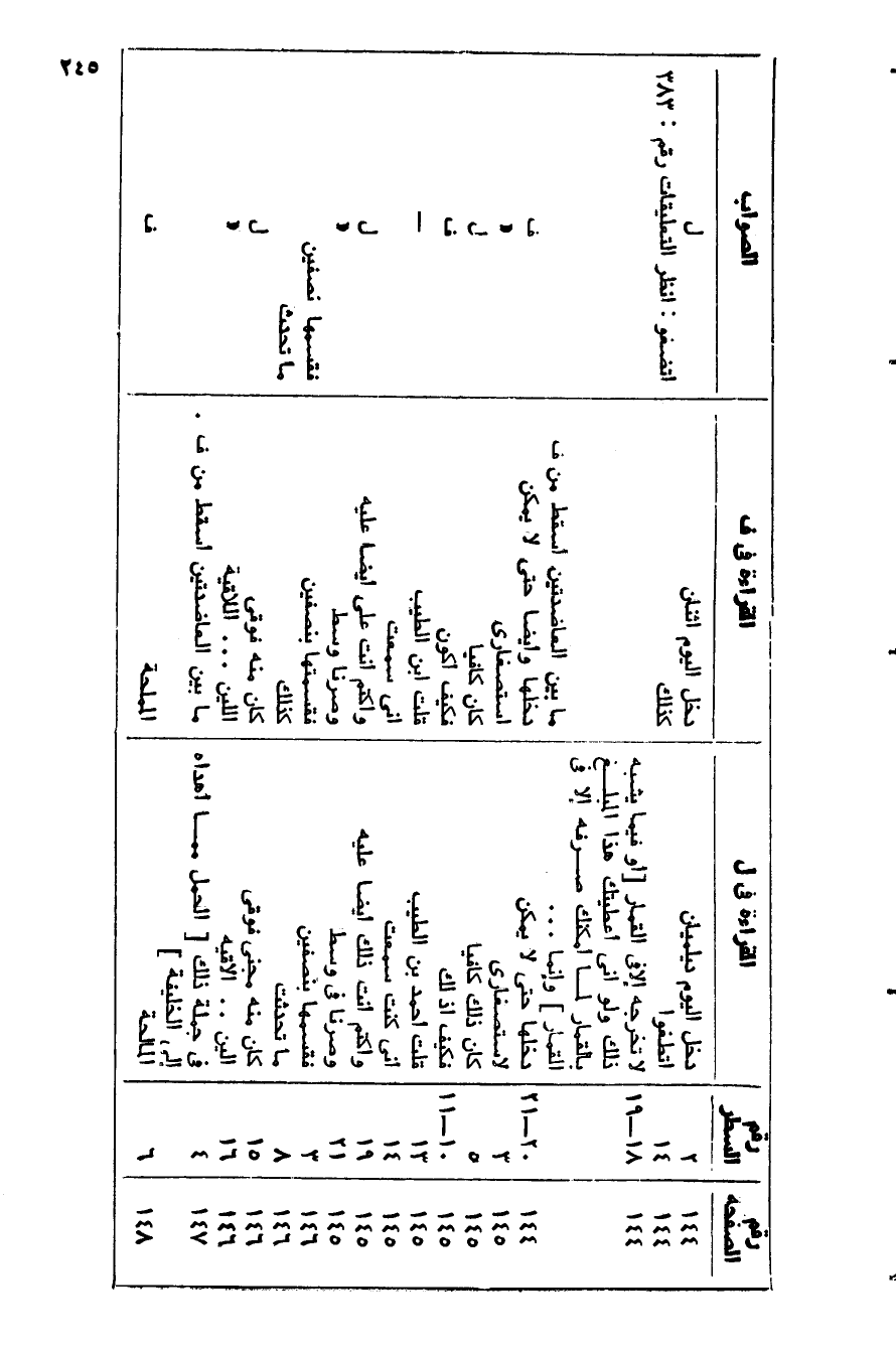 رقم الصفحة/ رقم السطر/ القراءة في ل/ القراءة في ف/ الصواب 144/ 2/ دخل اليوم ديلميان/ دخل اليوم اثنان/ ل 144/ 14/ اتطغوا/ كذلك/ اتضغوا: انظر التعليقات رقم: 383 144/ 18- 19/ لا تخرجه إلا في القمار [أو فيما يشبه ذلك ولو انى أعطيتك هذا المبلغ بالقمار لما أمكنك صرفه إلا في القمار] وإنما ... / ما بين العاضدتين أسقط من ف/ 144/ 20- 21/ دخلها حتى لا يمكن/ دخلها وأيضا حتى لا يمكن/ ف 145/ 3/ لاستصغارى/ استصغاري/ «145/ 5/ كان ذلك كافيا/ كان كافيا/ ل 145/ 10- 11/ فكيف إذ لك/ فكيف أكون/ ف 145/ 13/ قلت أحمد بن الطيب/ قلت ابن الطيب/- 145/ 14/ أنى كنت سمعت/ انى سمعت 145/ 19/ واكتم أنت ذلك أيضا عليه/ واكتم أنت على أيضا عليه/ ل 145/ 21/ وصرنا في وسط/ وصرنا وسط/ «146/ 3/ فقسمها بنصفين/ فقسمتها بنصفين/ فقسمها نصفين 146/ 8/ ما تحدثت/ كذلك/ ما تحدث 146/ 15/ كان منه مجنى فوقى/ كان منه فوقى/ ل 146/ 16/ الين.. الاقيه/ اللين ... الاقية/ «147/ 4/ في جملة ذلك [الحمل مما أهداه إلى الخليفة] / ما بين العاضدتين أسقط من ف.