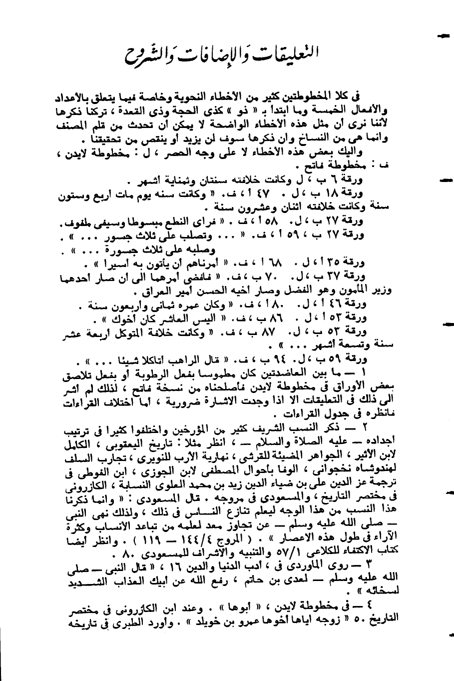 «1» - ما بين العاضدتين كان مطموسا بفعل الرطوبة أو بفعل تلاصق بعض الأوراق في مخطوطة لايدن فأصلحناه من نسخة فاتح، لذلك لم أشر الى ذلك في التعليقات الا إذا وجدت الإشارة ضرورية، أما اختلاف القراءات فانظره في جدول القراءات.